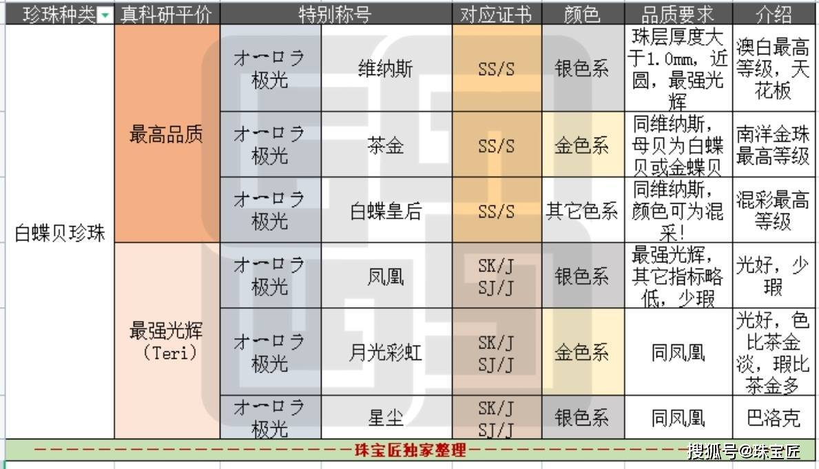 对于不同颜色、不同光泽、不同晕彩、不同品质的黑蝶贝珍珠的分级“真科研”官方给予下图表中的定义: