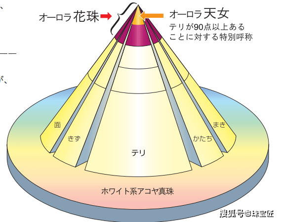 极光也称Aurora,对应的是真科研珍珠分级体系中独有的一项参数——TERI ,日文为テリ。“TERI”可以理解为光泽,但又不仅仅是指亮度,而是由两部分组成: