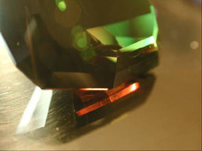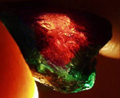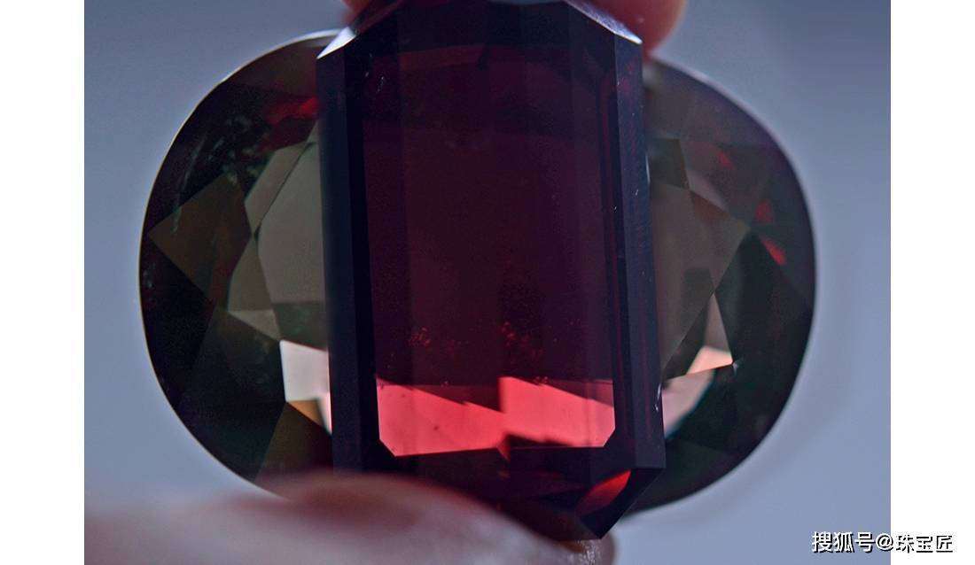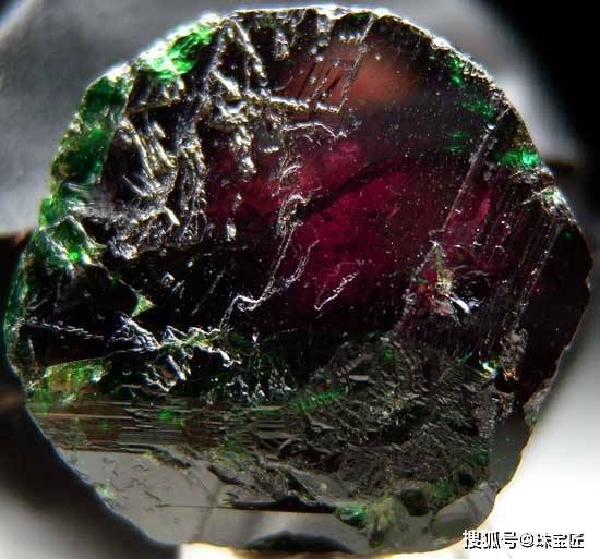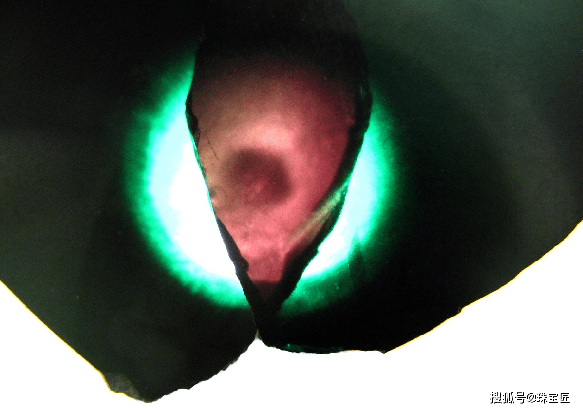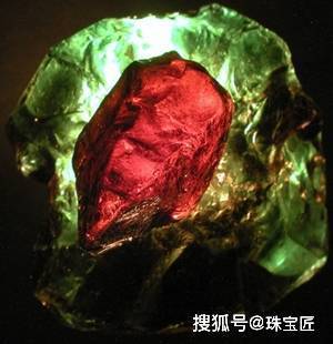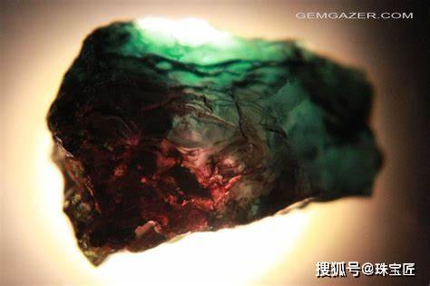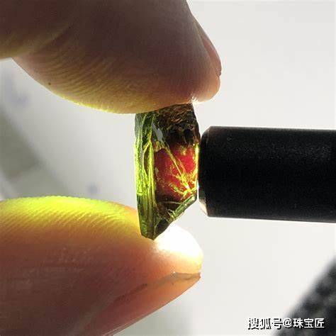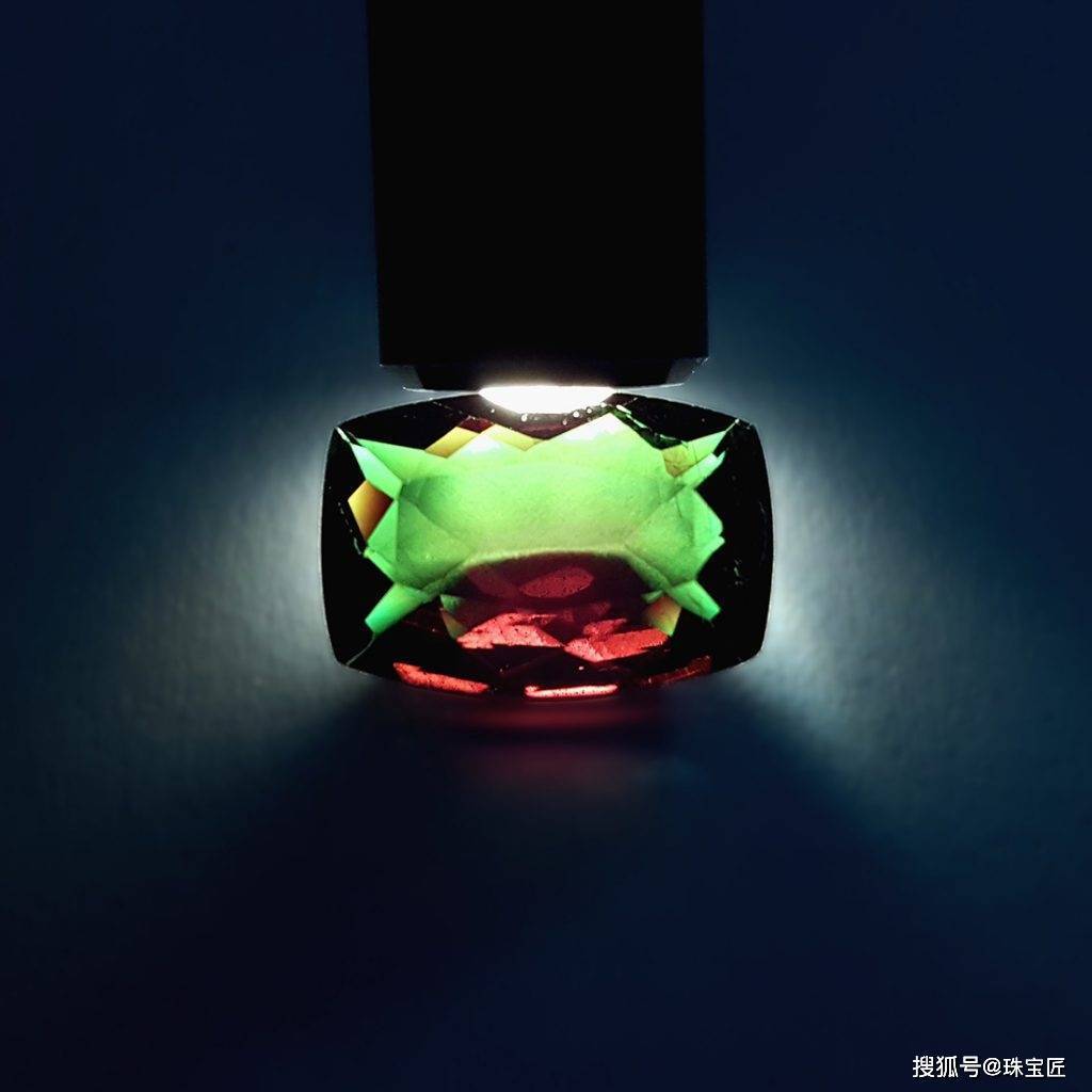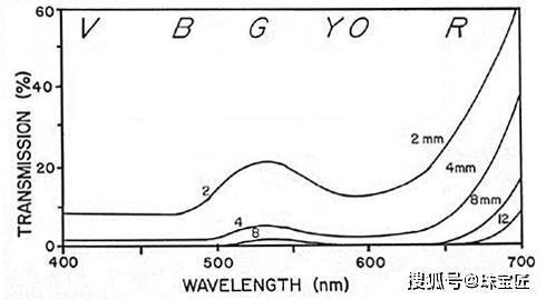 随着宝石厚度的增加,人眼看到的色调从绿色变为红色。