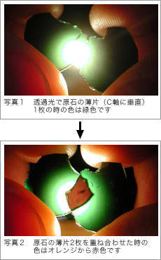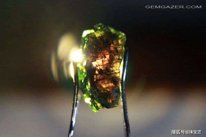 早在1849年,Haidinger在使用二色镜观察具有三色性的金绿宝石时,就发现了在灯光下的秘密:该宝石较薄的部分为带有紫色调的绿色,在宝石较厚的部分为红紫色。