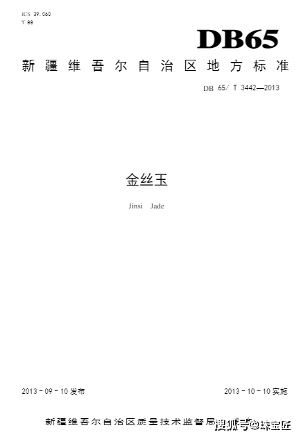 2013 年,新疆维吾尔自治区颁布实施了地方标准《金丝玉》(DB65/T3442-2013),对“金丝玉”这个新兴石英岩玉品种有了科学、准确的定义: