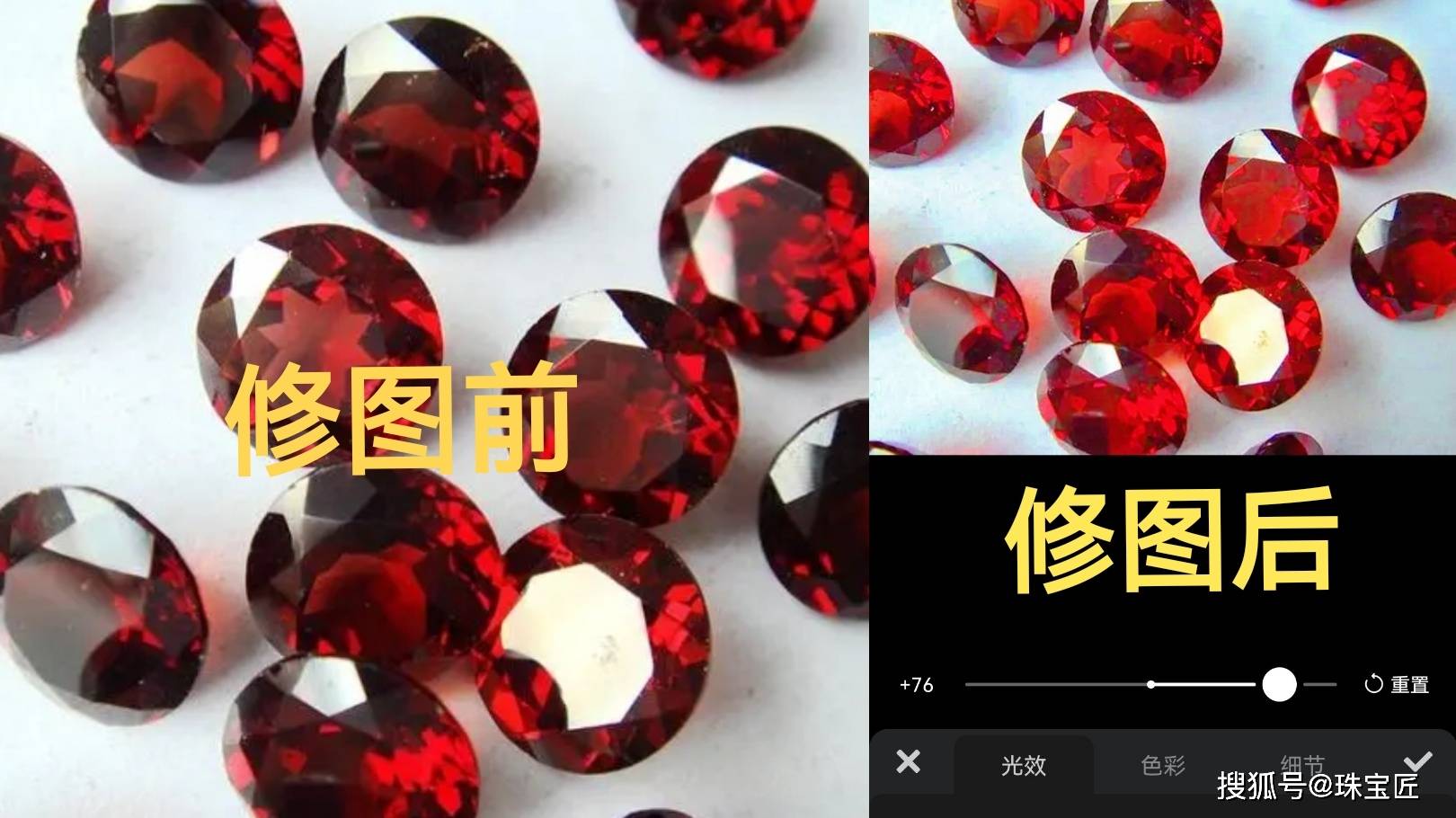 如果是迎着太阳光拍,颜色最亮的红色系石榴石大致也就是下图的颜色(珠宝匠实拍),室内背光颜色会偏暗。