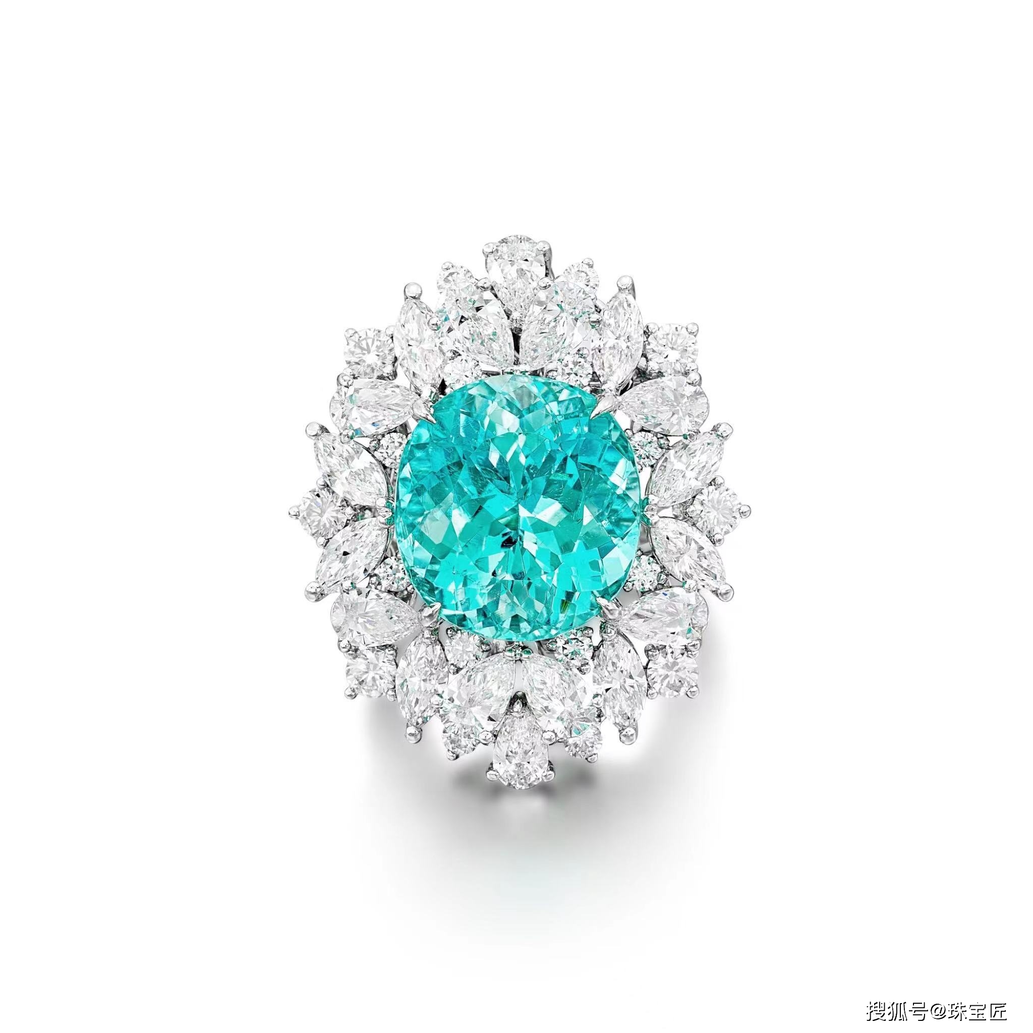 花卉图案,镶嵌一颗重13.39克拉的椭圆形帕莱巴型碧玺,饰以梨形、马眼形和明亮式切割钻石,18k白金底座,5号,附有两份宝石学报告;