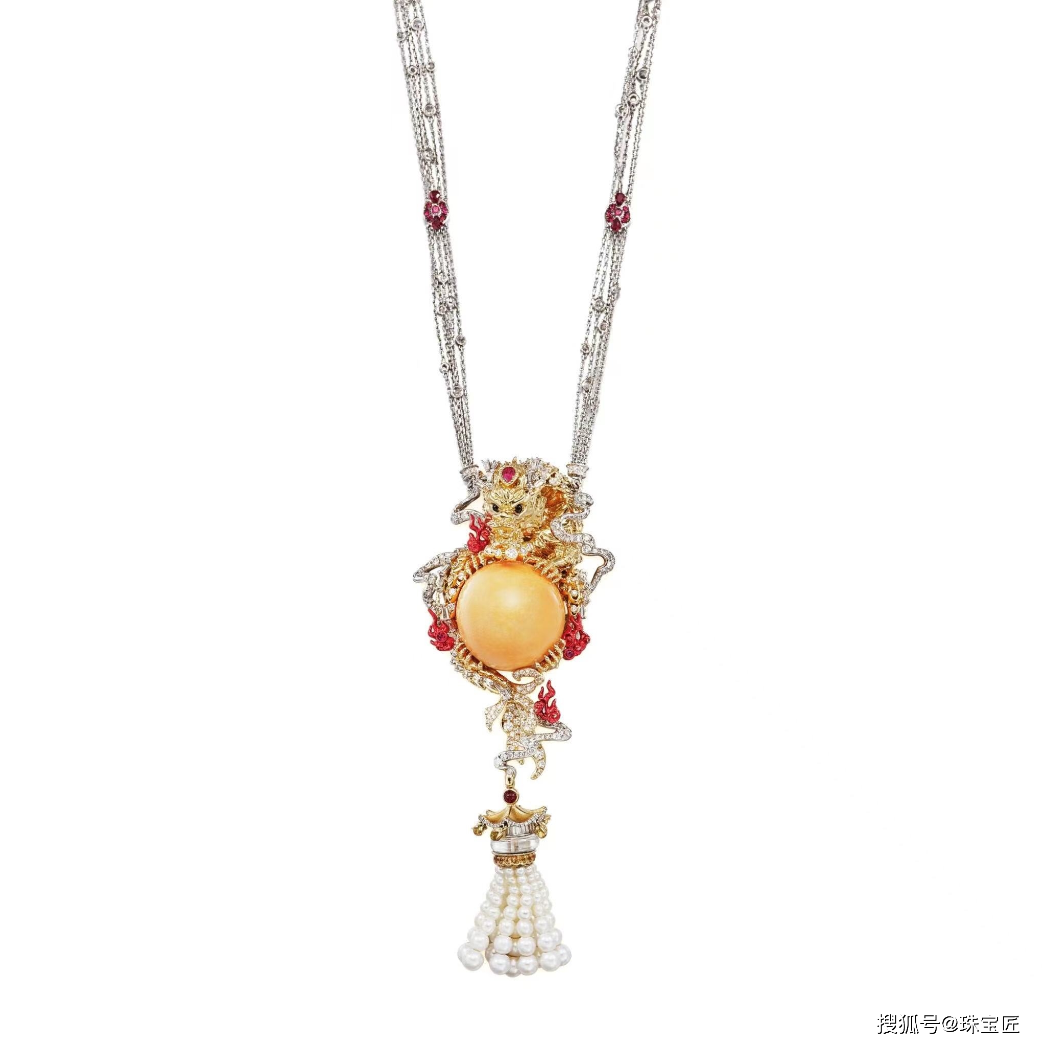 美乐珠重约78.98克拉,四周饰以黄色蓝宝石、钻石、红宝石等,长度约690毫米;