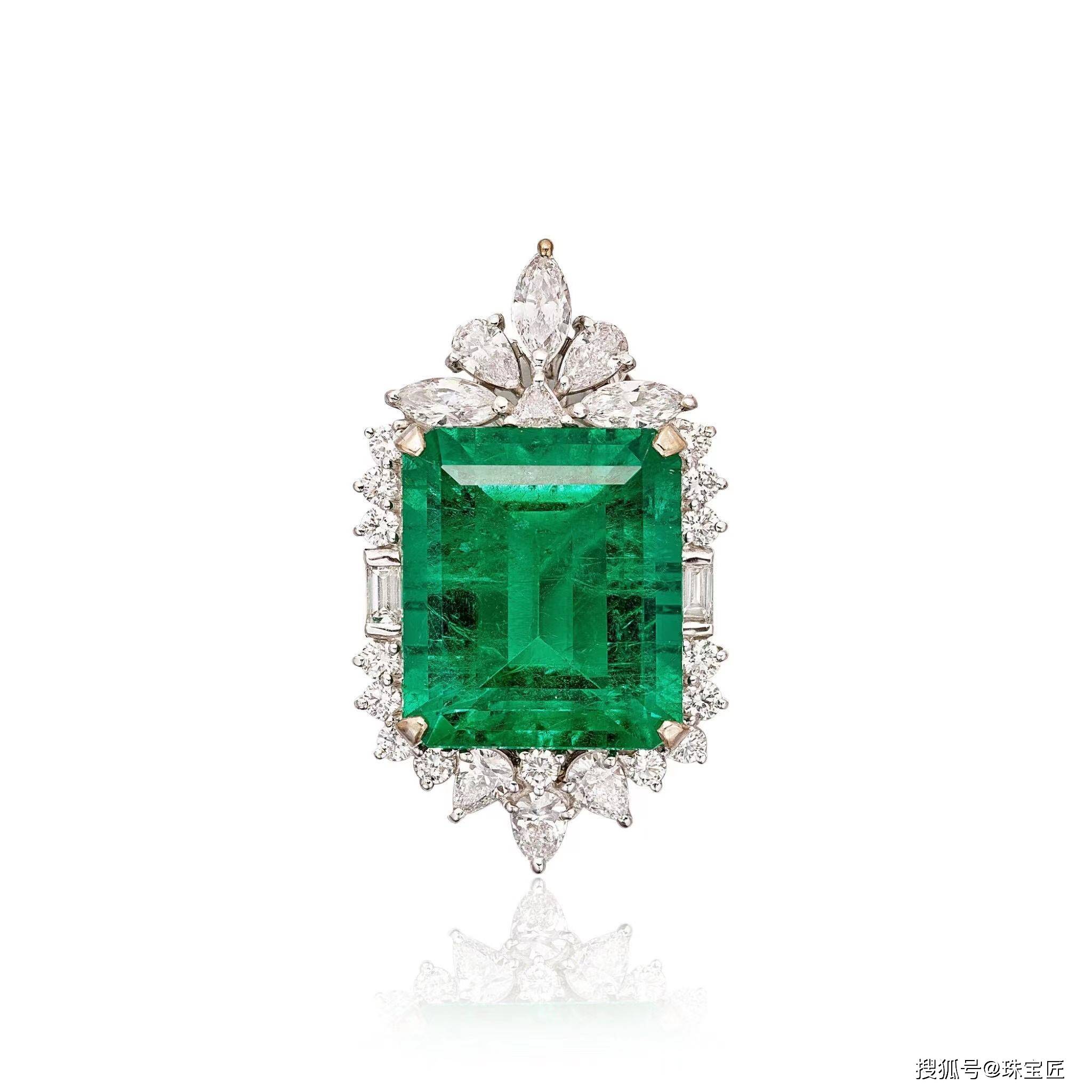 18k白金镶嵌一颗阶梯形切割祖母绿,饰以马眼形、梨形、明亮式切割、三角形和长方形钻石;