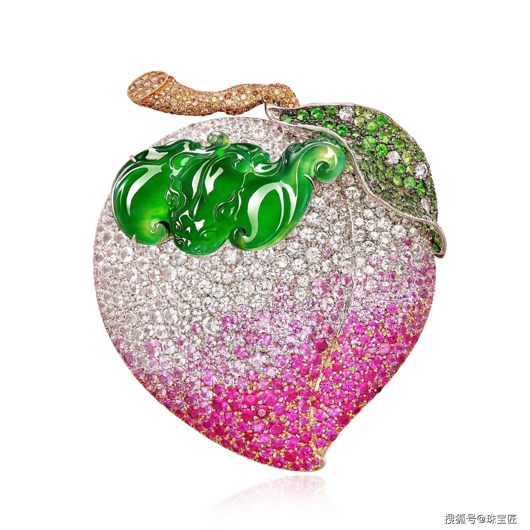 镶有明亮的苹果绿色翡翠,尺寸约20.78 x 38.823 x 5.75mm,四周镶有棕色钻石、石榴石、无色和粉色蓝宝石,附香港玉石实验室证书;