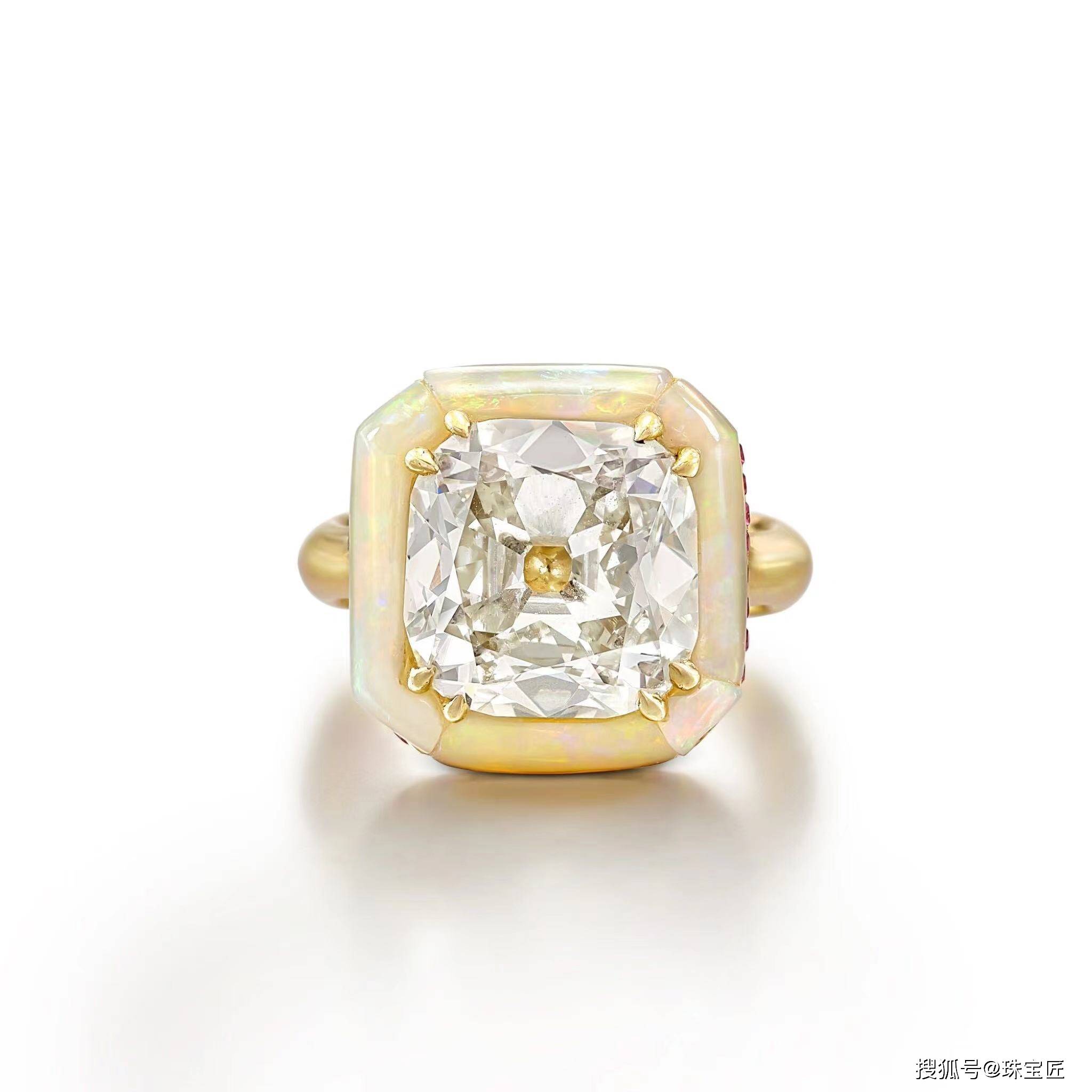 镶嵌一颗古老的矿山切割钻石,配以雕花蛋白石环绕,并饰以圆形切割红宝石,5号;