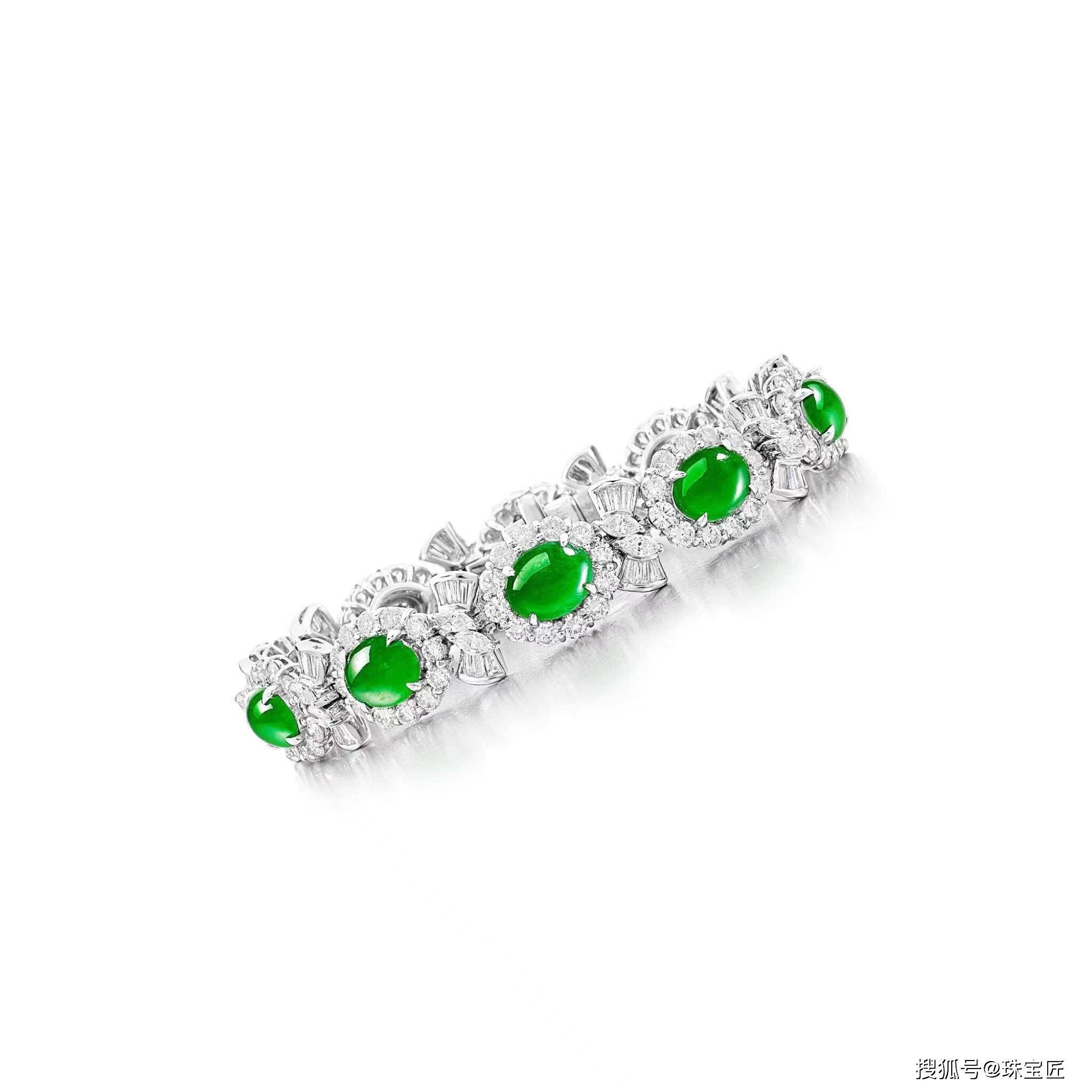 镶有10颗亮绿色、半透明的椭圆形翡翠,尺寸约8.36 x 6.80 x 2.36至7.31 x 6.09 x 2.23mm,四周点缀明亮式切割、梨形、长方形钻石带,长度约160毫米,随附香港玉石实验室证书;