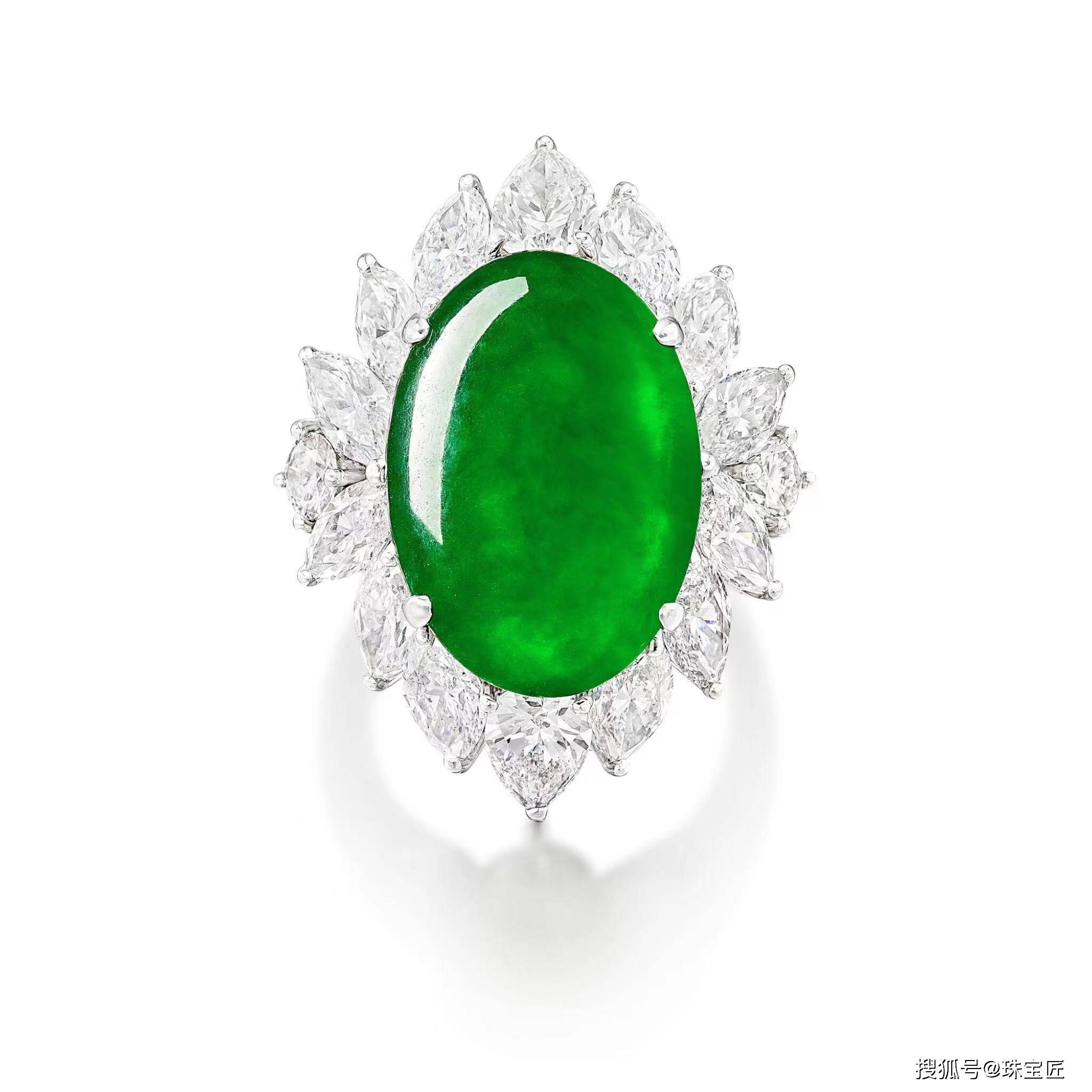 18k白金底座上镶嵌一颗亮绿色、半透明性极佳的翡翠,尺寸约18.93 x 13.26 x 4.15mm,四周围镶有马眼形和梨形钻石,5号;