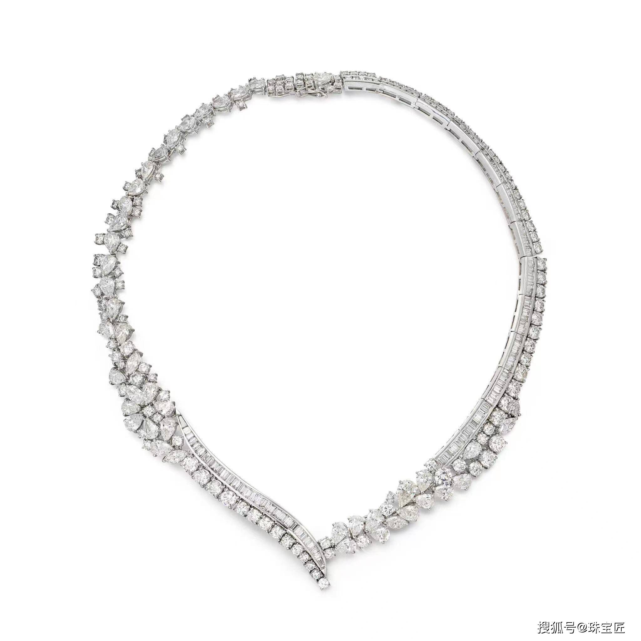 卷轴式设计,镶嵌长方形、梨形和明亮式切割钻石,镶嵌在18k白金上,长度约380毫米.;