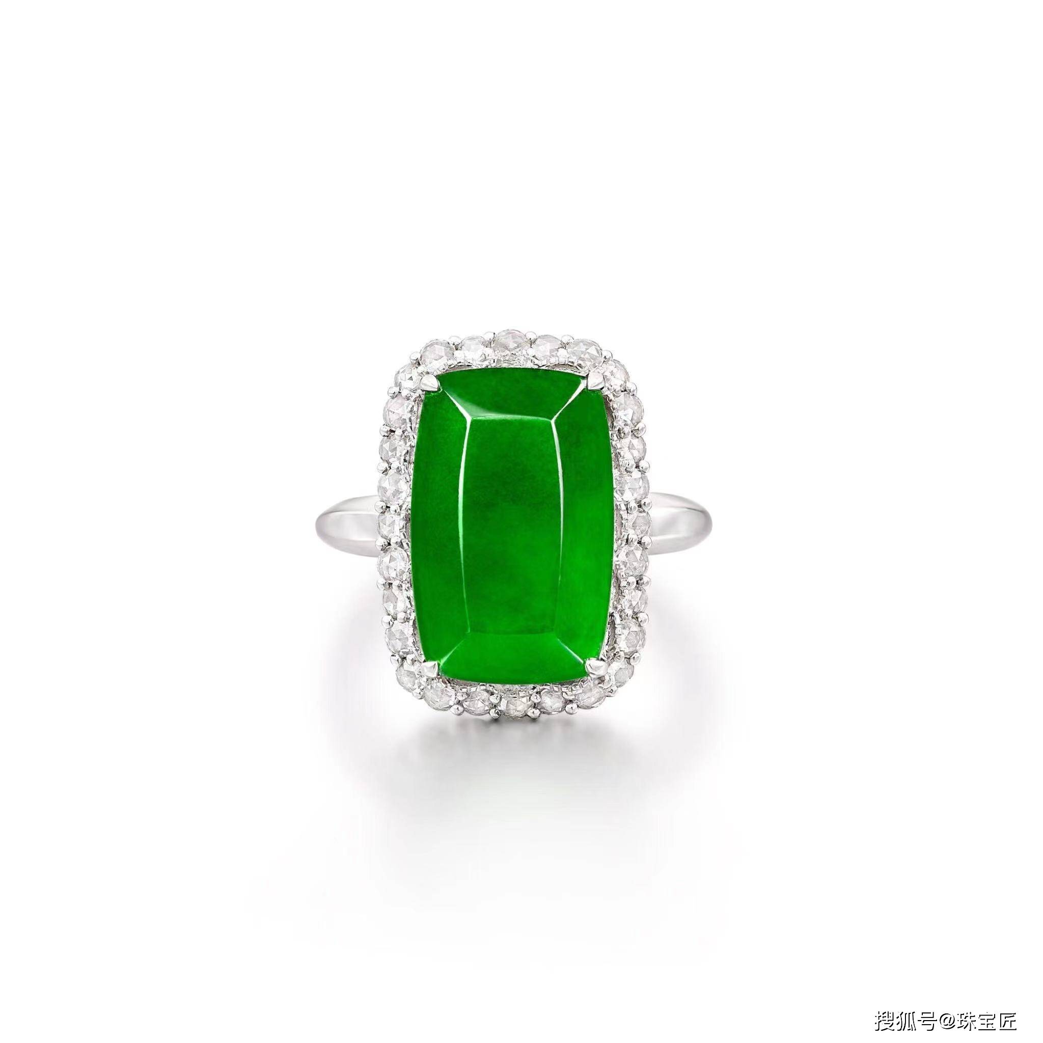 镶有亮绿色、半透明性极佳的翡翠,尺寸约16.26 x 10.45 x 2.63mm,周围镶有玫瑰形切割钻石,并饰有明亮式切割钻石,镶嵌在18k白金上,6号,随附香港玉石实验室证书;