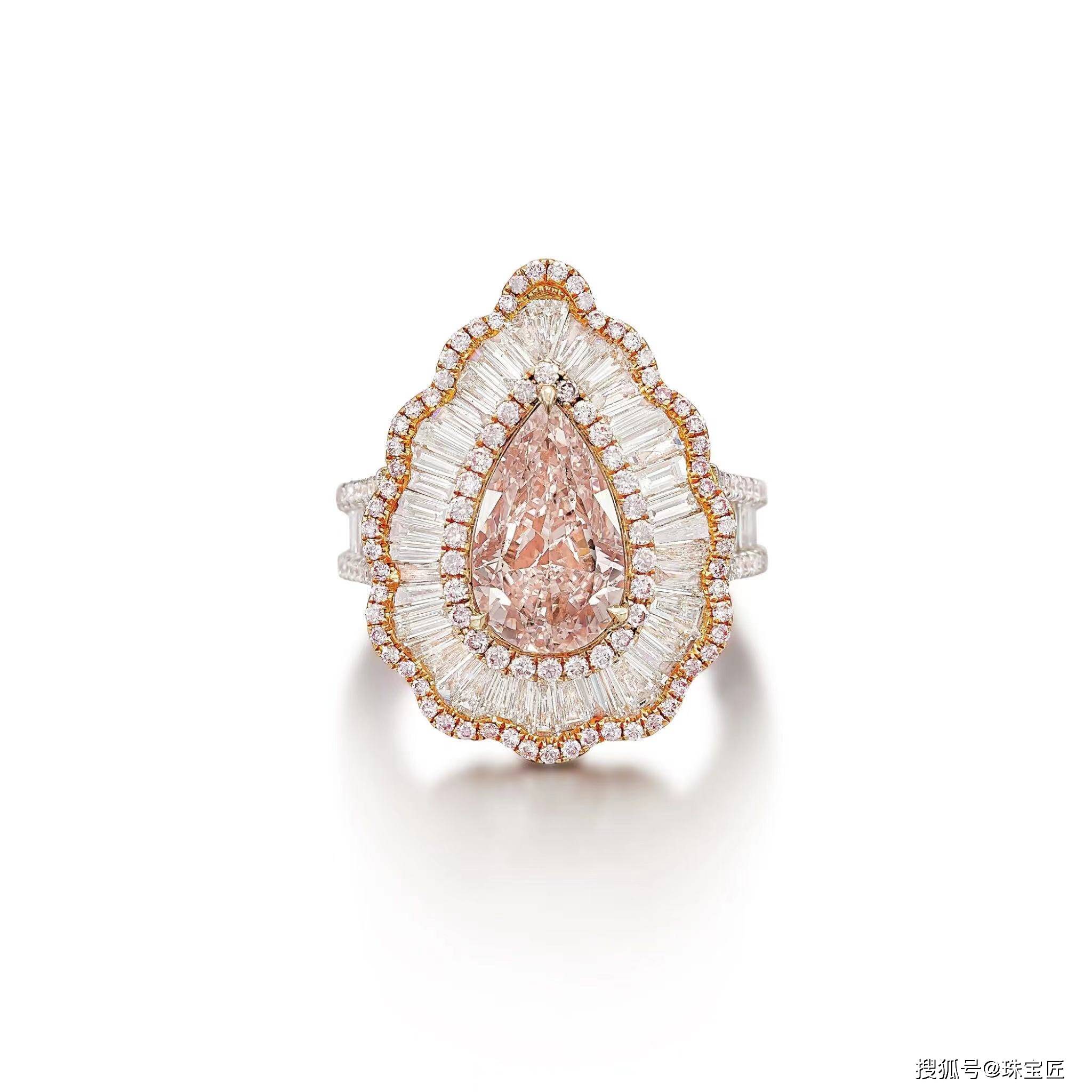 18k白金底座上镶有一颗重2.68克拉的梨形淡粉色彩钻,周围环绕着明亮式切割的粉色钻石和梯形钻石,以及明亮式切割和梯形钻石。5号,随附GIA报告;