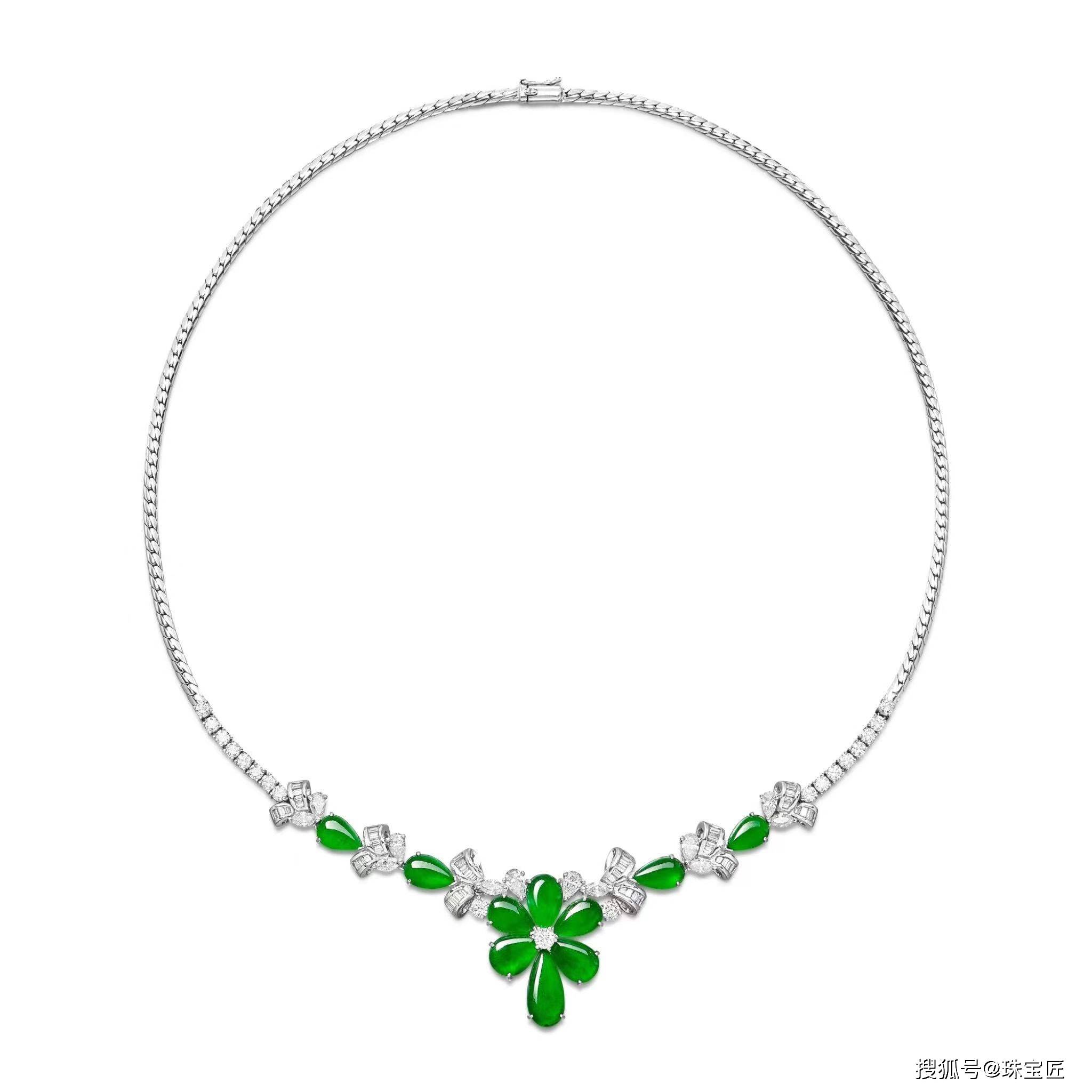 项链上镶有梨形翡翠,尺寸约12.96 x 6.35 x 2.35至7.61 x 5.18 x 1.95mm,透明度极佳,饰有明亮式切割、梨形、马眼形、长方形钻石,搭配18k白金项链,长度约为415毫米随附香港玉石实验室证书;