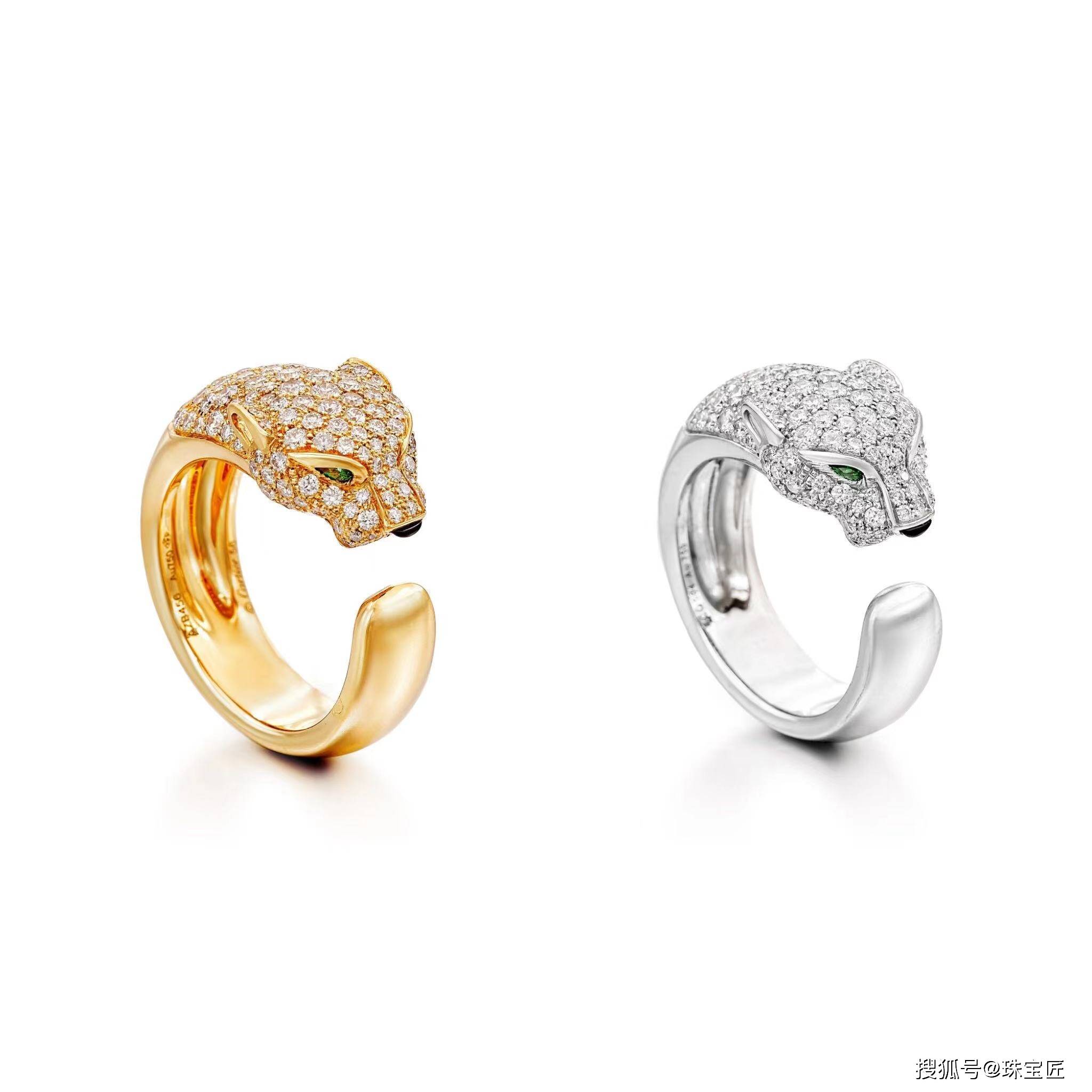 两枚“Panthère de Cartier”戒指,分别镶嵌明亮式切割钻石,眼睛由梨形祖母绿镶嵌而成,鼻子由缟玛瑙镶嵌分别是7号和7号,都有卡地亚的签名;