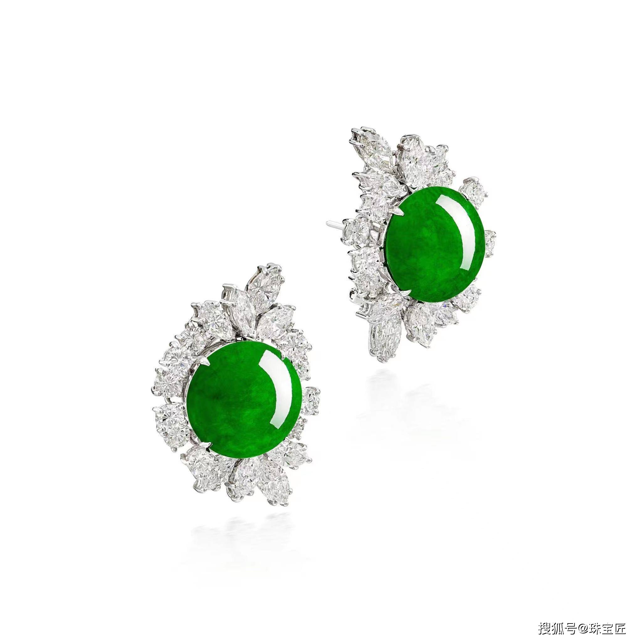 耳环上镶嵌有亮绿色、半透明性极佳的翡翠,尺寸约15.03 x 15.18 x 5.47和15.24 x 14.94 x 5.97mm,四周饰有马眼形、明亮式切割钻石,镶嵌在18k白金上;