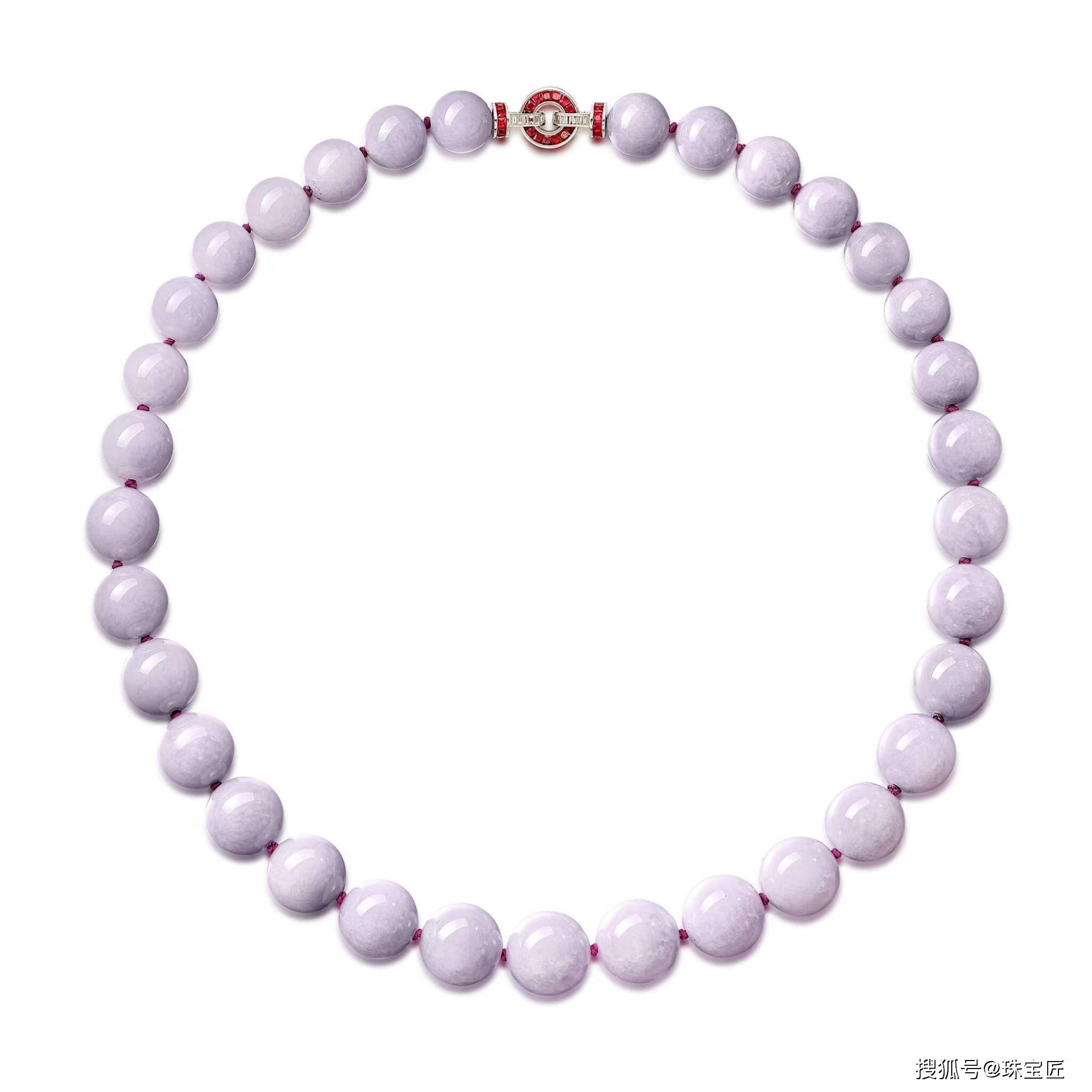 由33颗半透明的淡紫色翡翠珠子组成,翡翠珠子大约18.26到14.55毫米,搭配饰有长方形钻石、红宝石的表扣,镶嵌在18k白金上,长度约600毫米,随附香港玉石实验室;