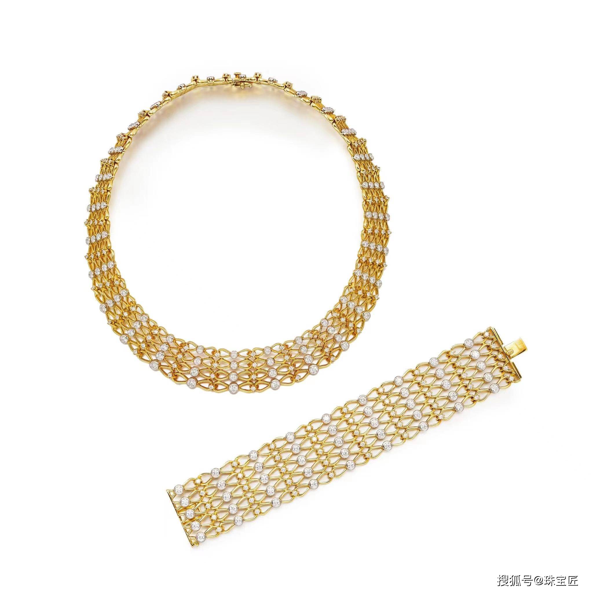 由交替排列的明亮式切割钻石组成的项链,长度约400毫米;和一个手镯成套,长度约180毫米;两款腕表均采用18k黄金和铂金镶嵌,署名蒂芙尼公司;