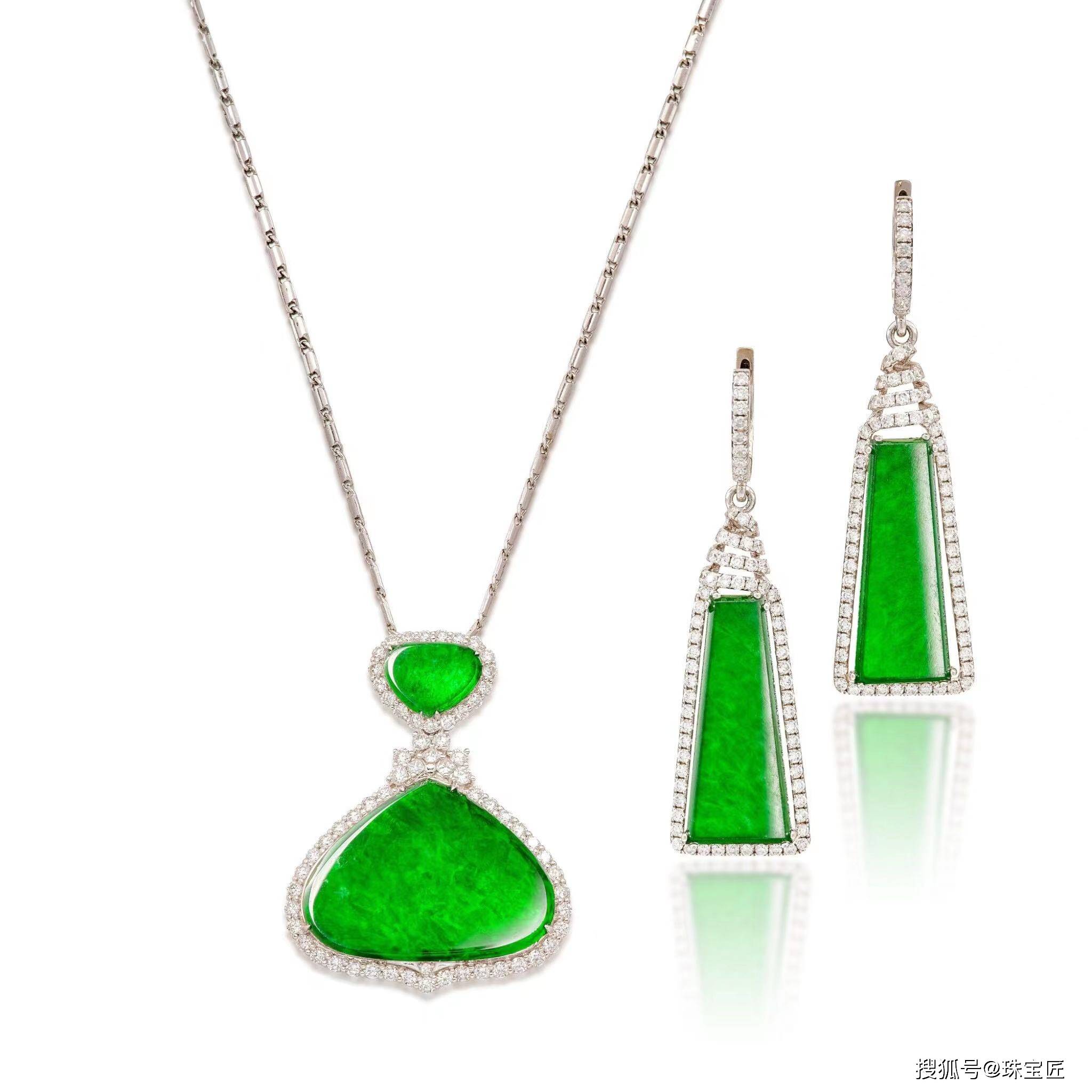 又一个挂坠和一对耳环组成,挂坠上镶嵌有2块深绿色、半透明性极佳的翡翠,尺寸约为19.66 x 26.76 x 1.55和7.90 x 10.58 x 1.47mm,四周饰以明亮式切割和方形钻石长度约460毫米;