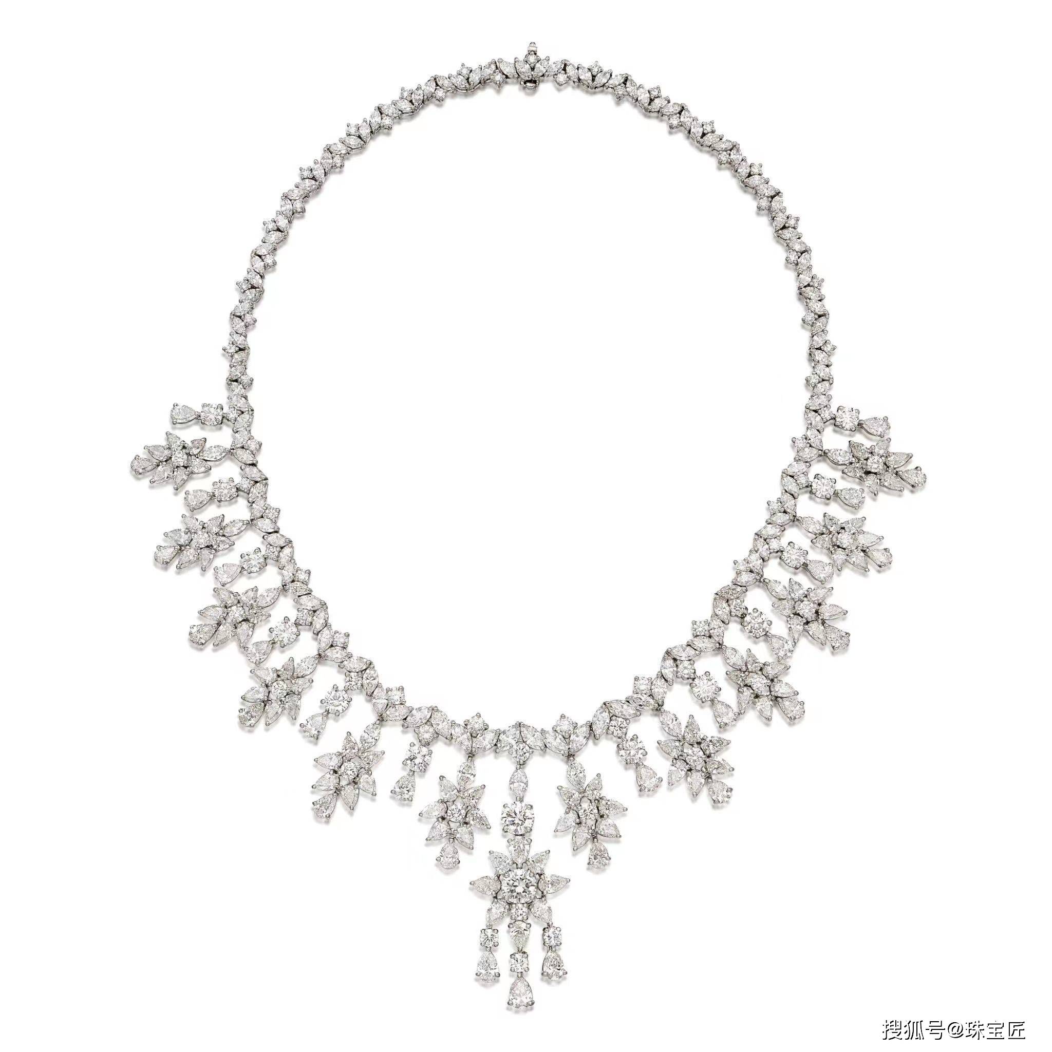 花卉图案,正面悬挂铰接式流苏,镶嵌明亮式切割、梨形和马眼形钻石,铂金镶嵌,长度约415毫米;