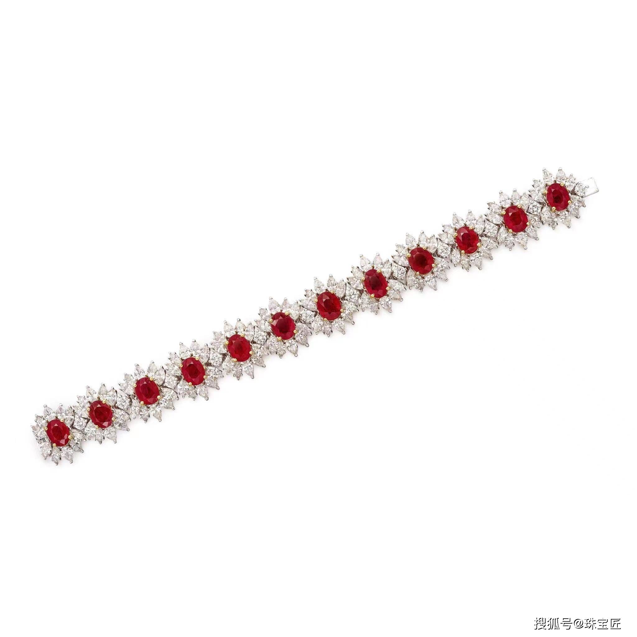 花卉图案,镶嵌12颗椭圆形红宝石,每颗宝石周围环绕一颗马眼形和梨形钻石,中间间隔着明亮式切割钻石,镶嵌在18k白金上,长度约175毫米;