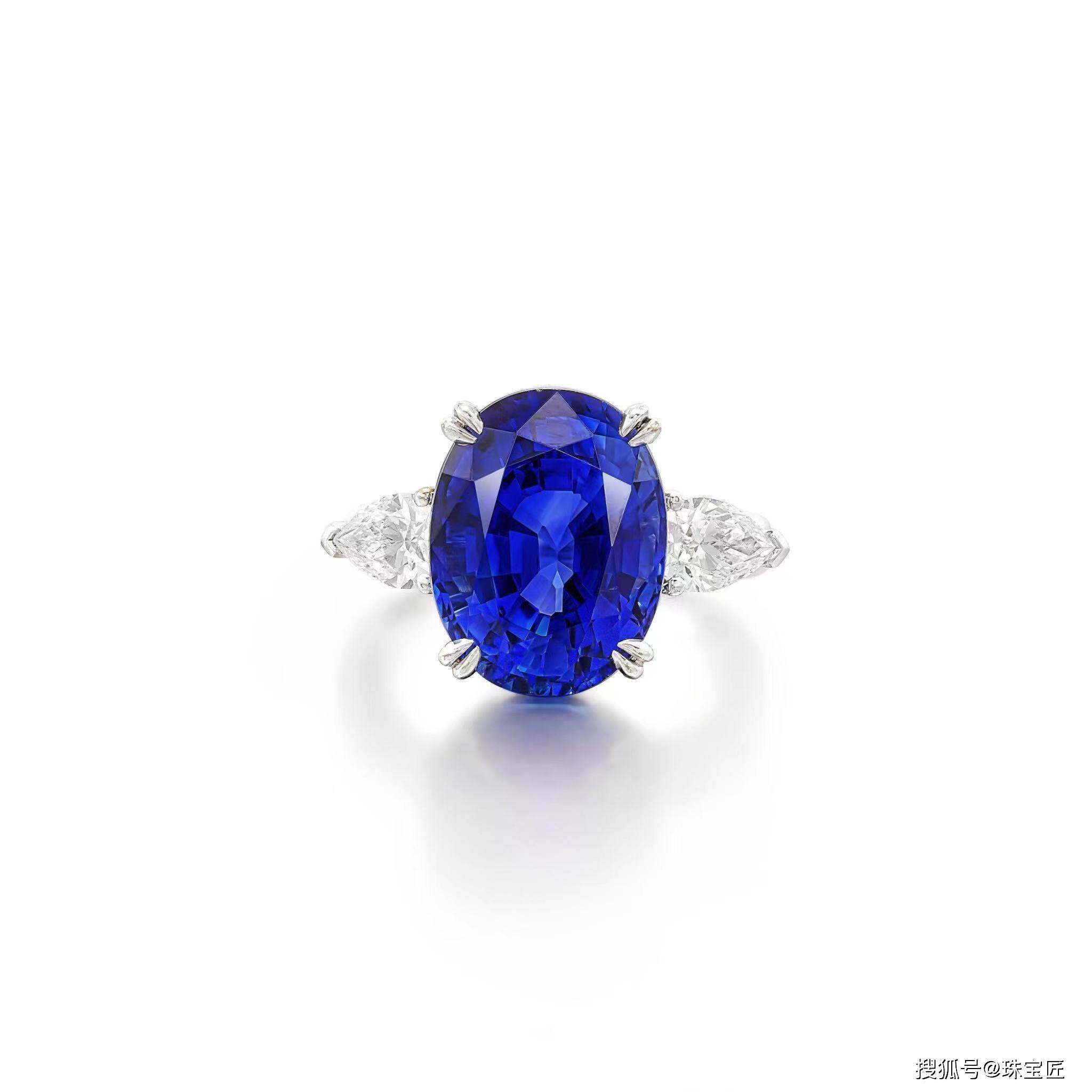 镶嵌一颗重约11.61克拉的椭圆形蓝宝石,两侧是两颗梨形钻石,镶嵌在18k白金上,6号;
