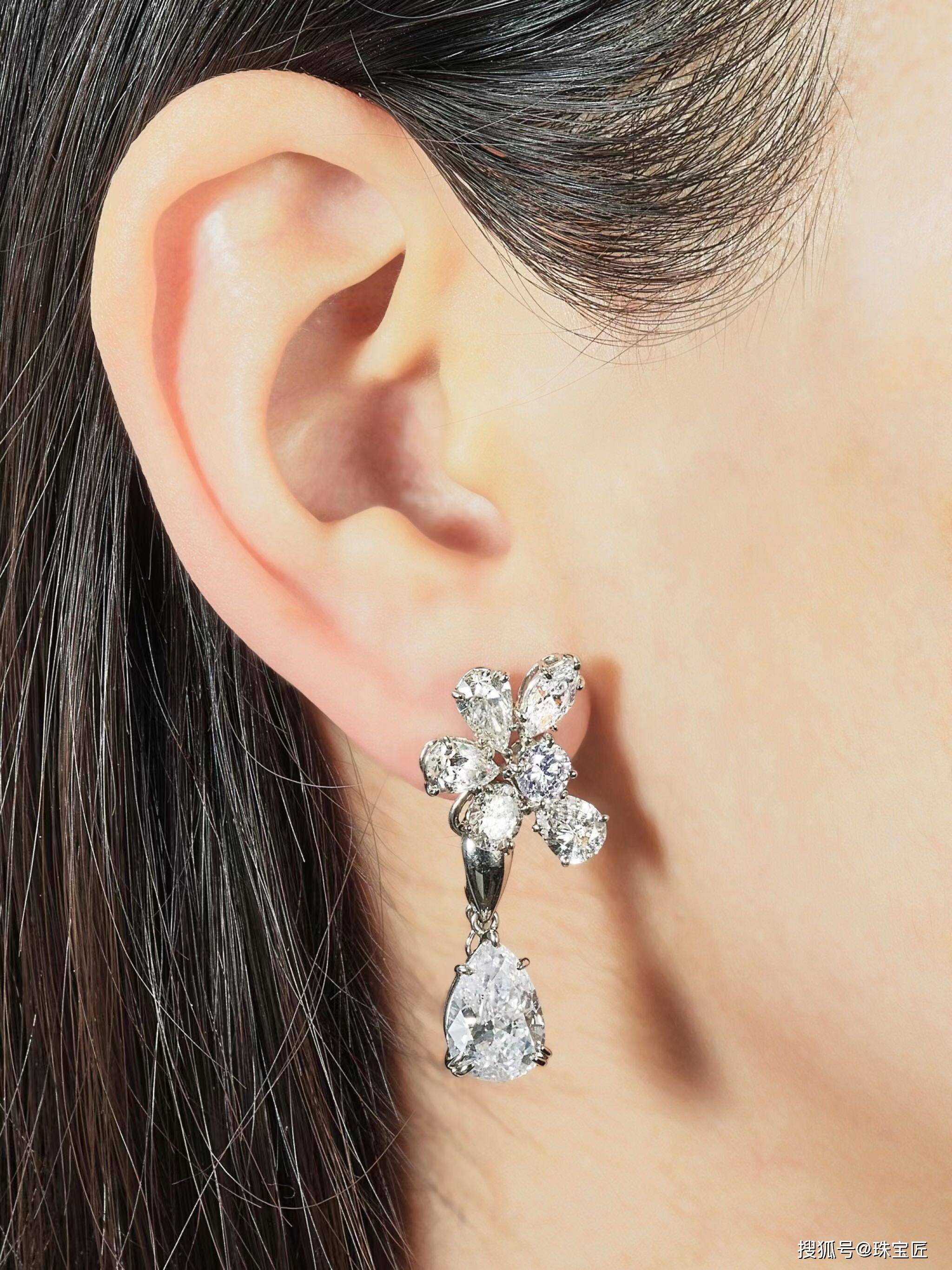 每颗分别悬挂一颗重3.00克拉和3.01克拉的梨形钻石至不同形状的钻石串顶部,镶嵌在铂金上,随附GIA报告;