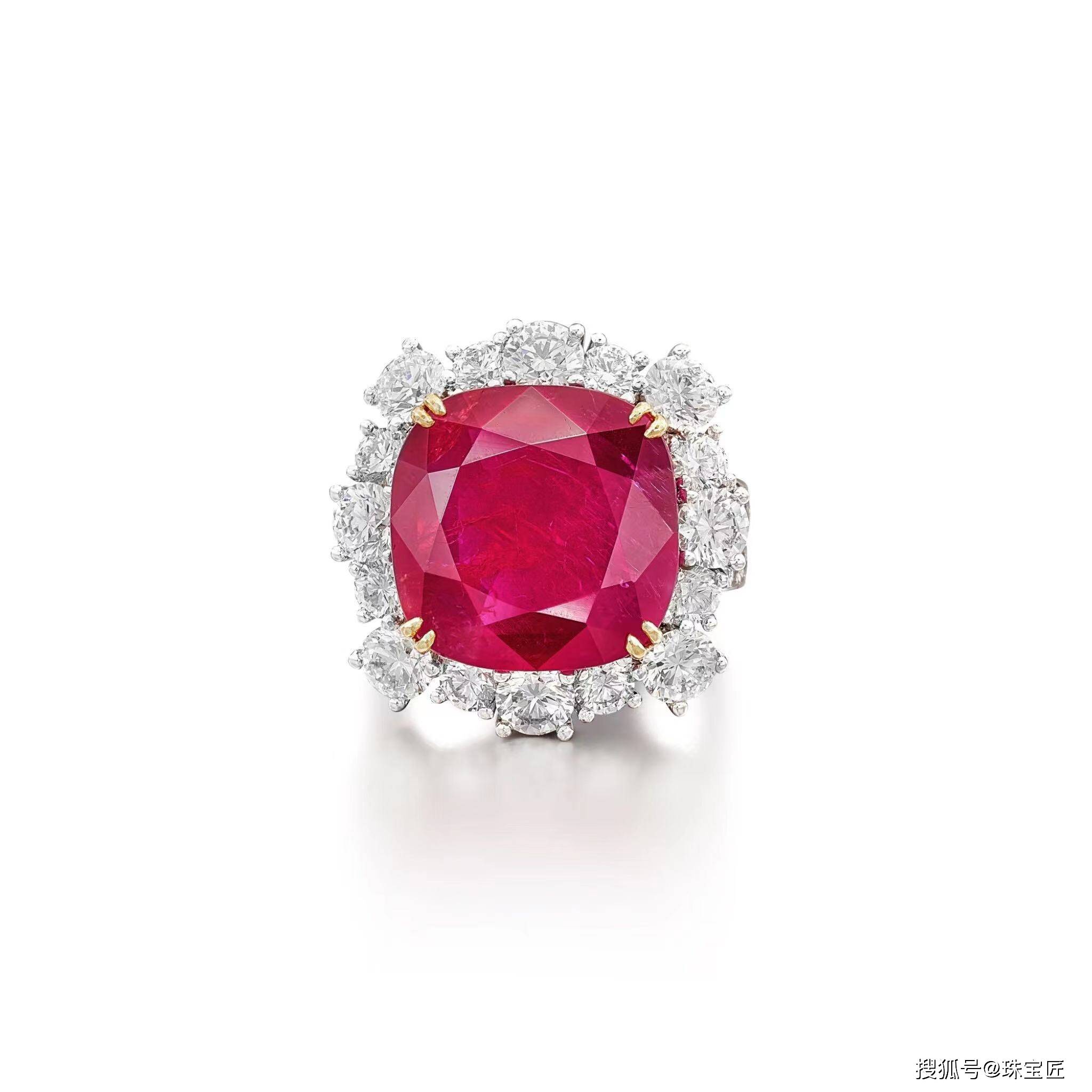 镶嵌一颗重约13.28克拉的枕形红宝石,明亮式切割钻石环绕和分叉肩部,铂金和18k黄金镶嵌,6号,随附SSEF报告;