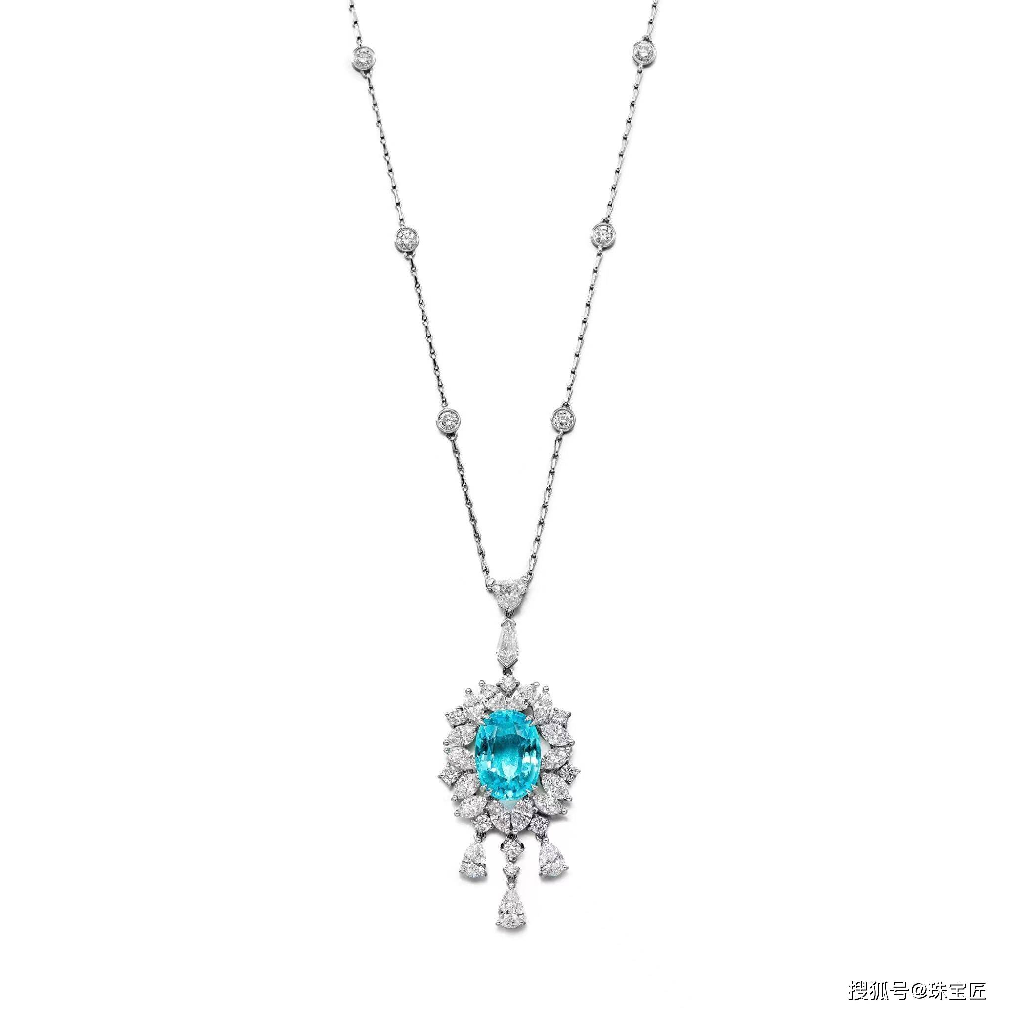 环型设计,悬挂铰接式流苏,镶嵌一颗重约5.10克拉的椭圆形帕拉伊巴型碧玺,饰以马眼形、梨形、六边形、肩章形和明亮式切割钻石,链节项链上镶嵌有夹头镶嵌明亮式切割钻石,镶嵌在18k白金上,可调节长度约为465和405毫米,随附Gübelin报告;
