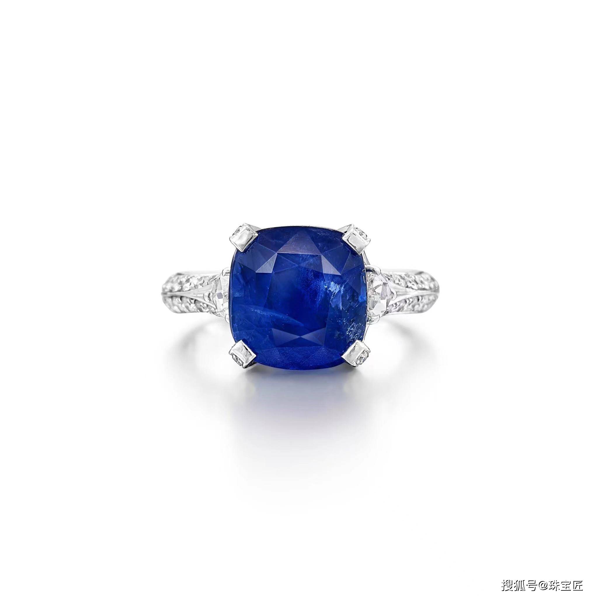 镶嵌一颗重8.25克拉的枕形蓝宝石,两侧是两颗玫瑰型切割钻石,镶嵌在18k白金上,7号;