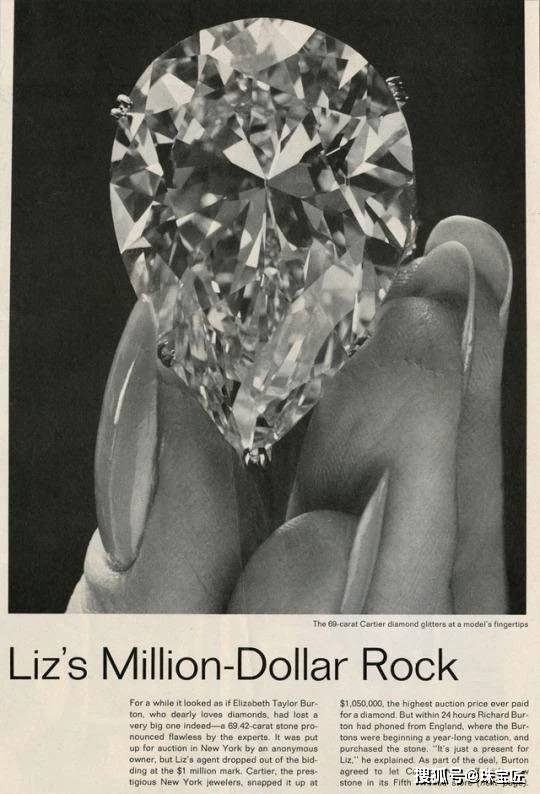 当时,理查德·伯顿正在为妻子伊丽莎白·泰勒满世界搜寻生日礼物,当他见到这枚重达69.42 克拉梨形钻石戒指时,一眼便相中了,于是开出了100万美金的高价,委托代理人进行代拍。