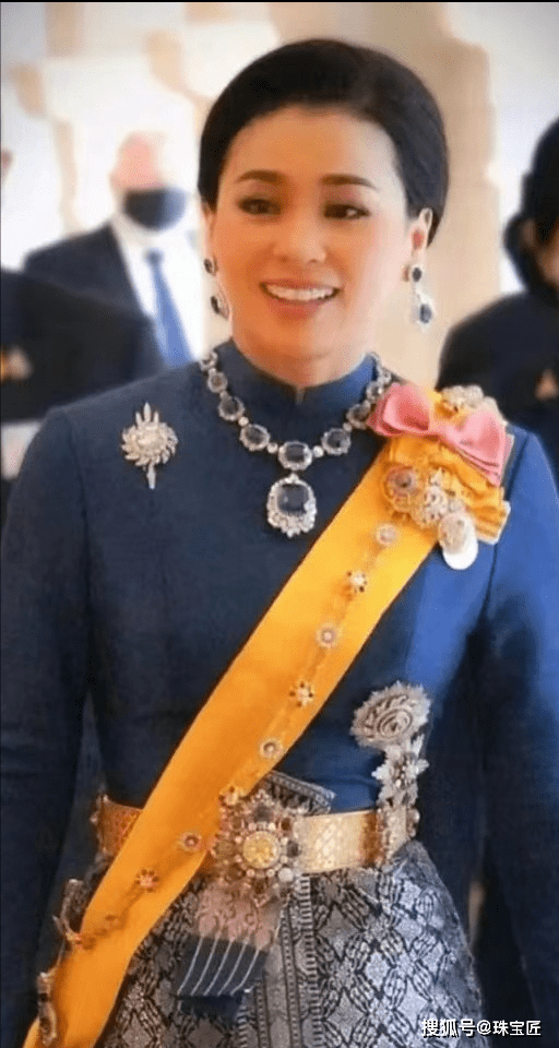 王后苏缇达一袭深蓝色泰式礼服,搭配一条镶嵌8种彩宝的五彩宝石腰带。
