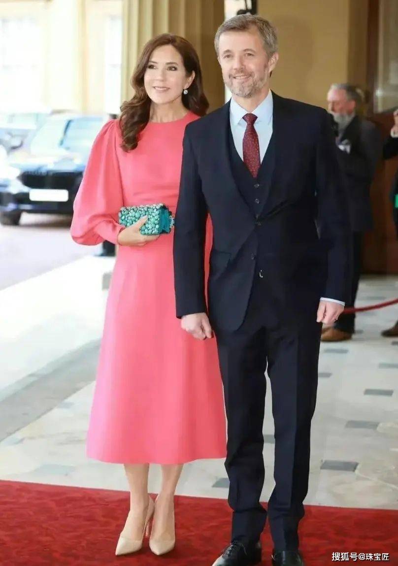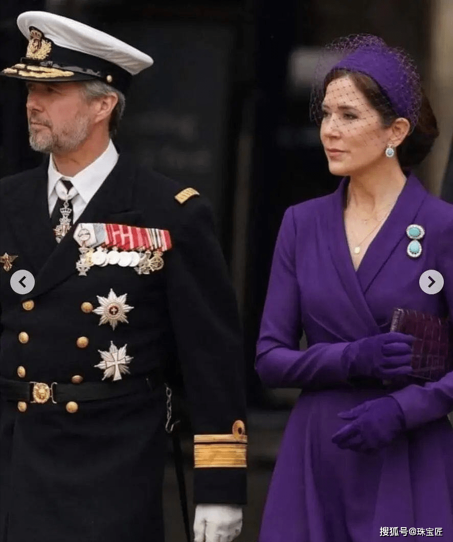 胸前点缀的绿松石胸针及绿松石耳环,来自丹麦女王玛格丽特二世,脖颈处还叠戴了2条金项链,整个人看起来精美雅致,品味超凡脱俗。
