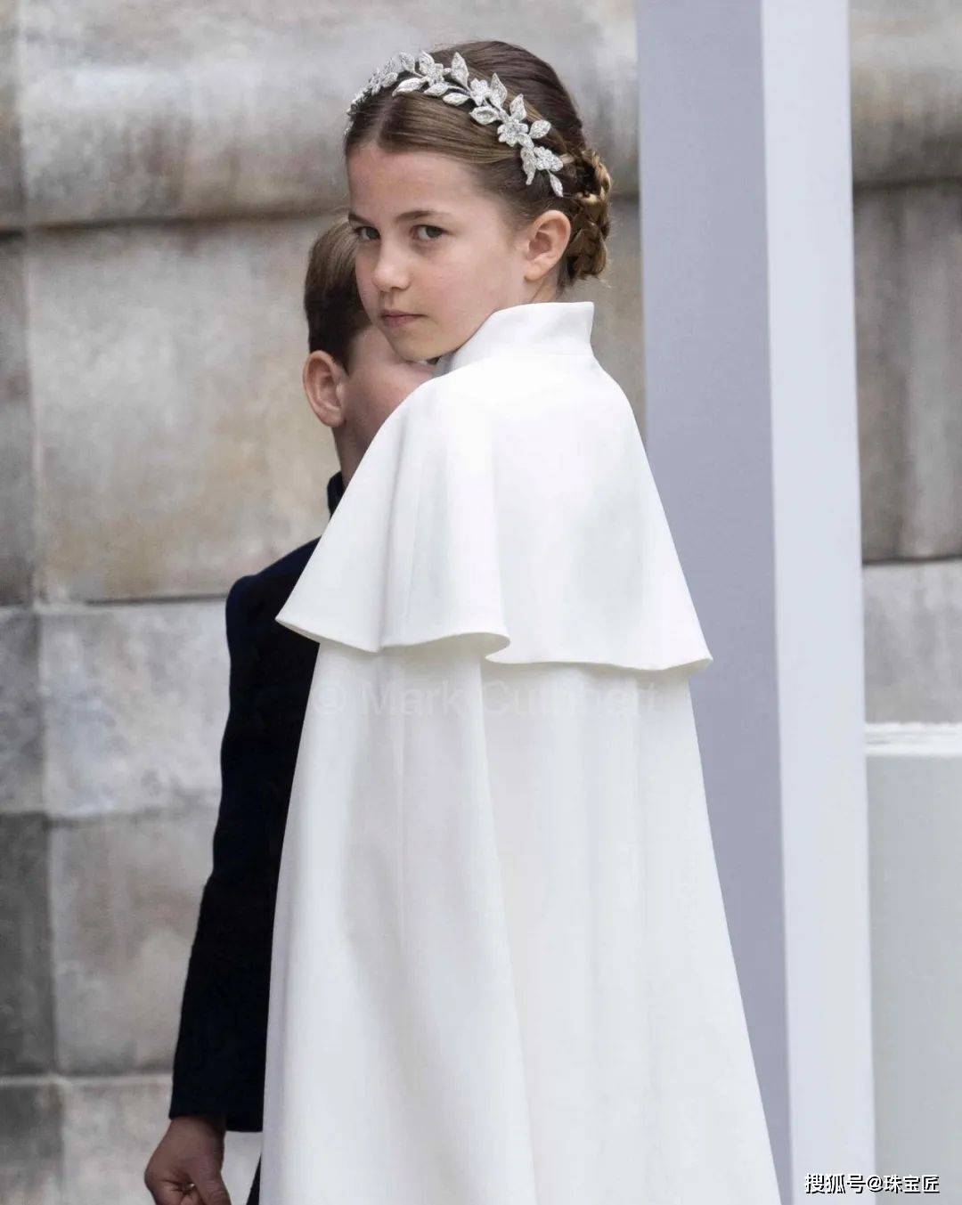 跟在威廉王子和凯特王妃后面的夏洛特小公主,身披白色斗篷,佩戴与母亲凯特王妃的同款月桂头饰,王者气质浑然天成,霸气侧漏!