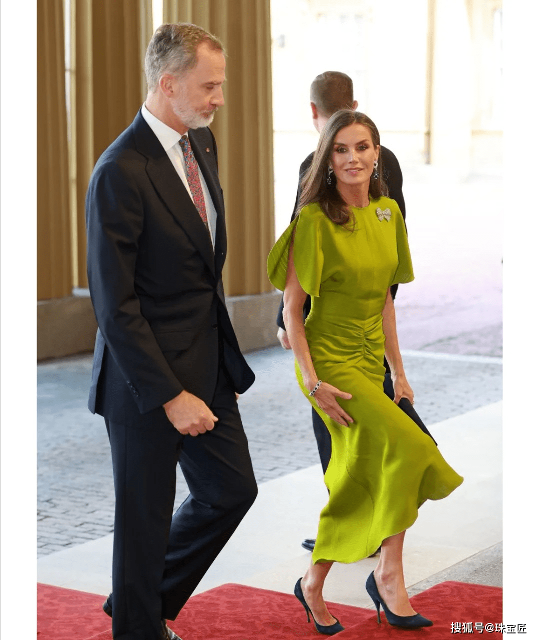 在加冕前的招待会上, 莱蒂齐亚王后一袭来自英国品牌Victoria Beckham2023SS绿色连衣裙,搭配钻石蝴蝶胸针,以及蓝宝石钻石耳环,艳压全场。