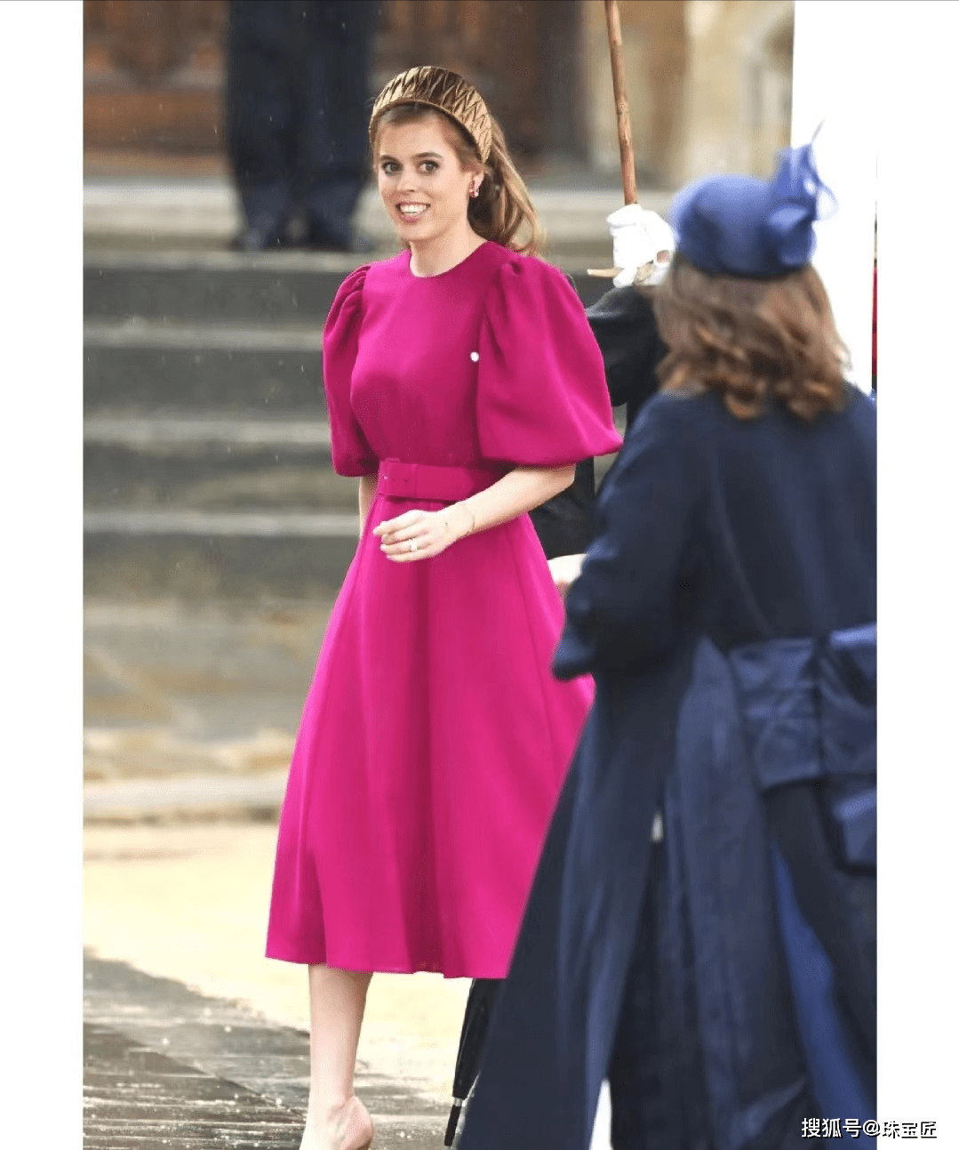 相对于朝气蓬勃的约克碧翠丝公主,约克尤金妮公主的装扮则沉稳了不少。