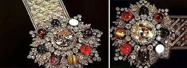 这条腰带的腰带扣是由红宝石、祖母绿、石榴石、青金石等8种彩色宝石镶嵌而成,在彩色宝石的中间围绕着一个巨大的黄色钻石,四周点缀着大小不一的钻石,样式十分奢华。