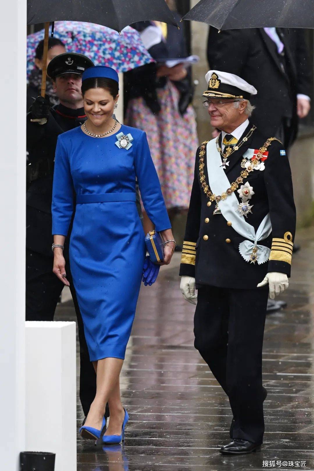卡尔十六世身穿挂满勋章的军装,维多利亚王储一身典雅的王室蓝套装,脖颈上点缀的一条钻石项链恰到好处,整个人高贵典雅,气质非凡。