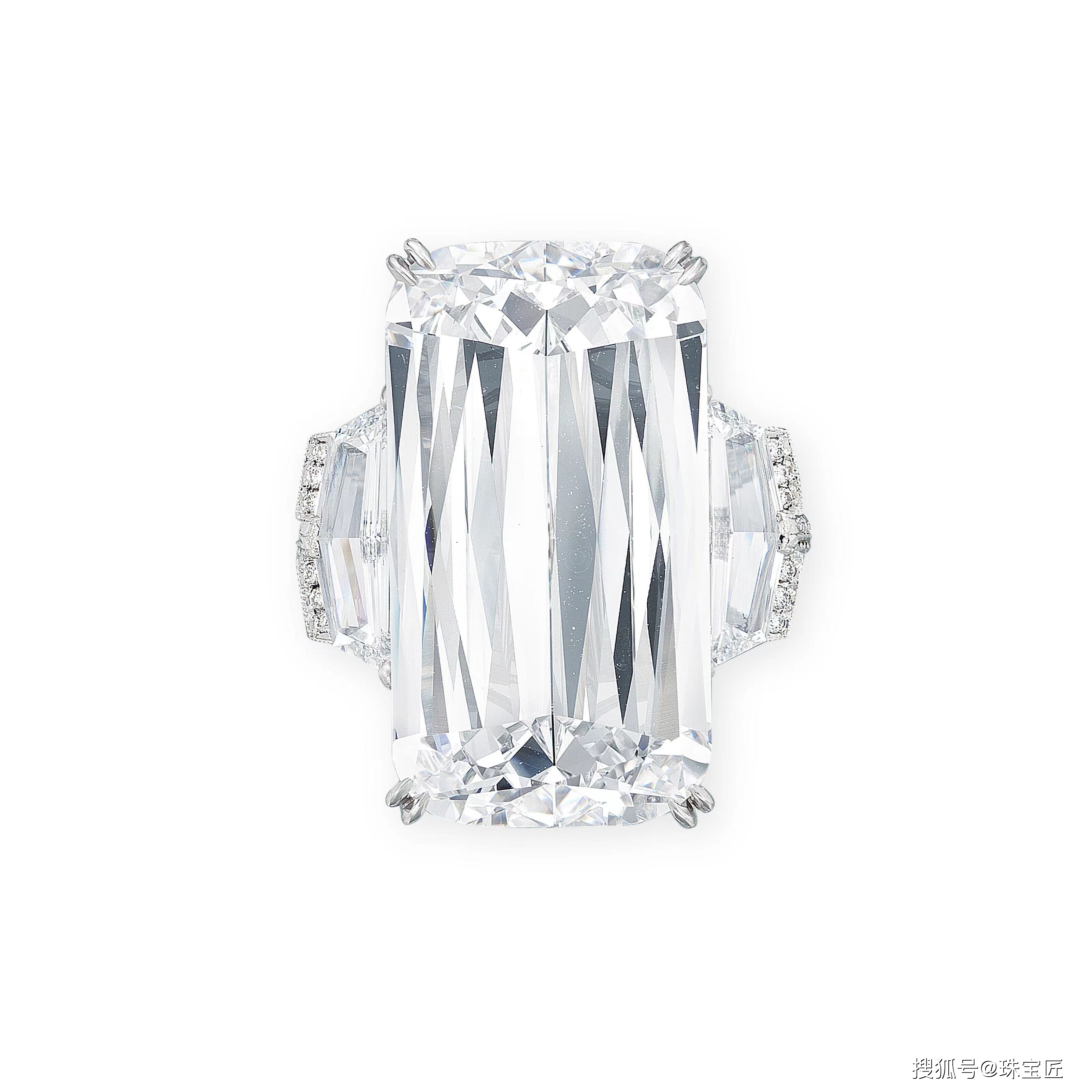 Mitsuo Kaji 设计,主石是一颗21.75克拉长方形D色 Type lla 钻石,两侧以钻石作为点缀,附GIA证书;