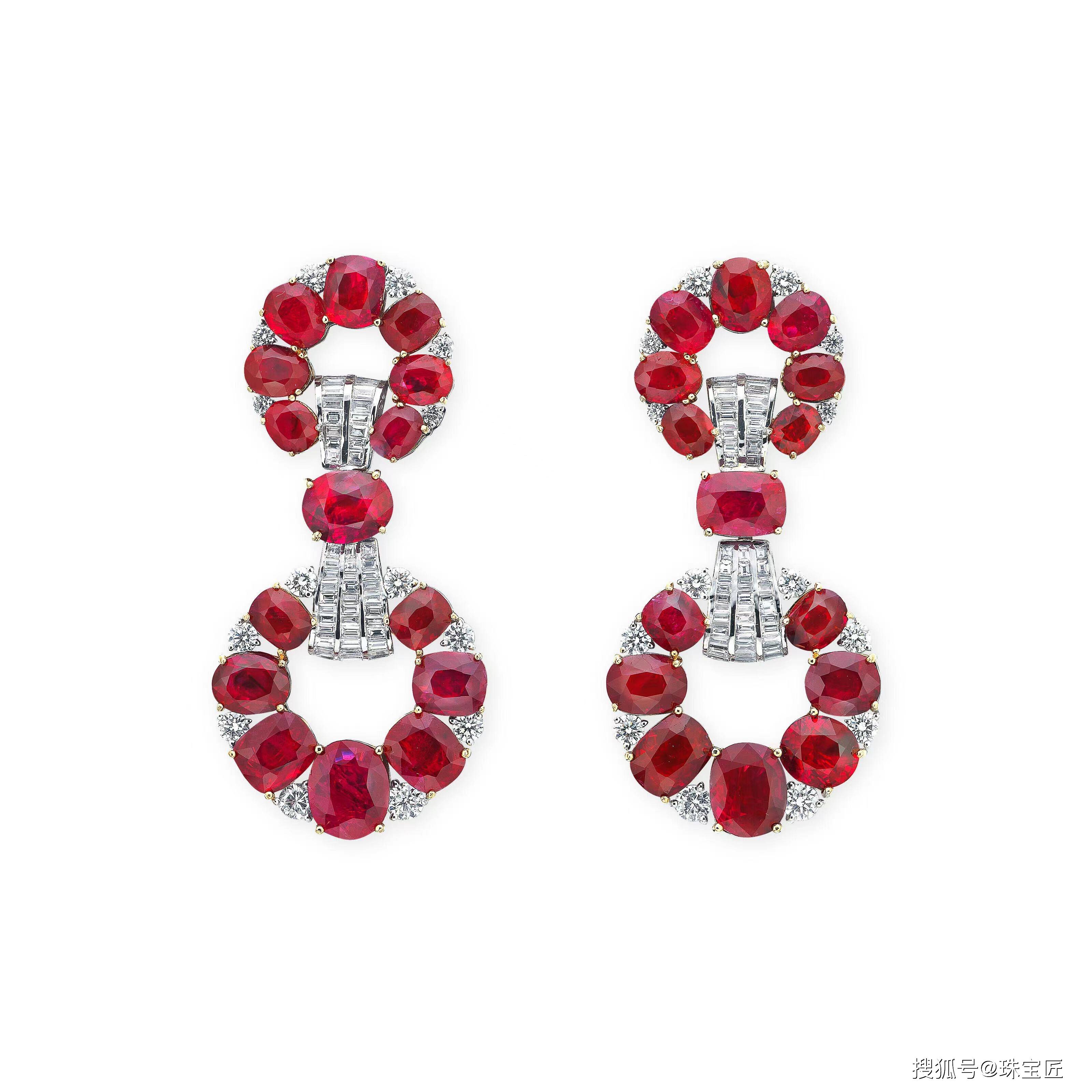 红宝石及钻石耳环,红宝石采用枕形及椭圆形切割,产自缅甸,为天然鸽血红级别,附古柏林证书;