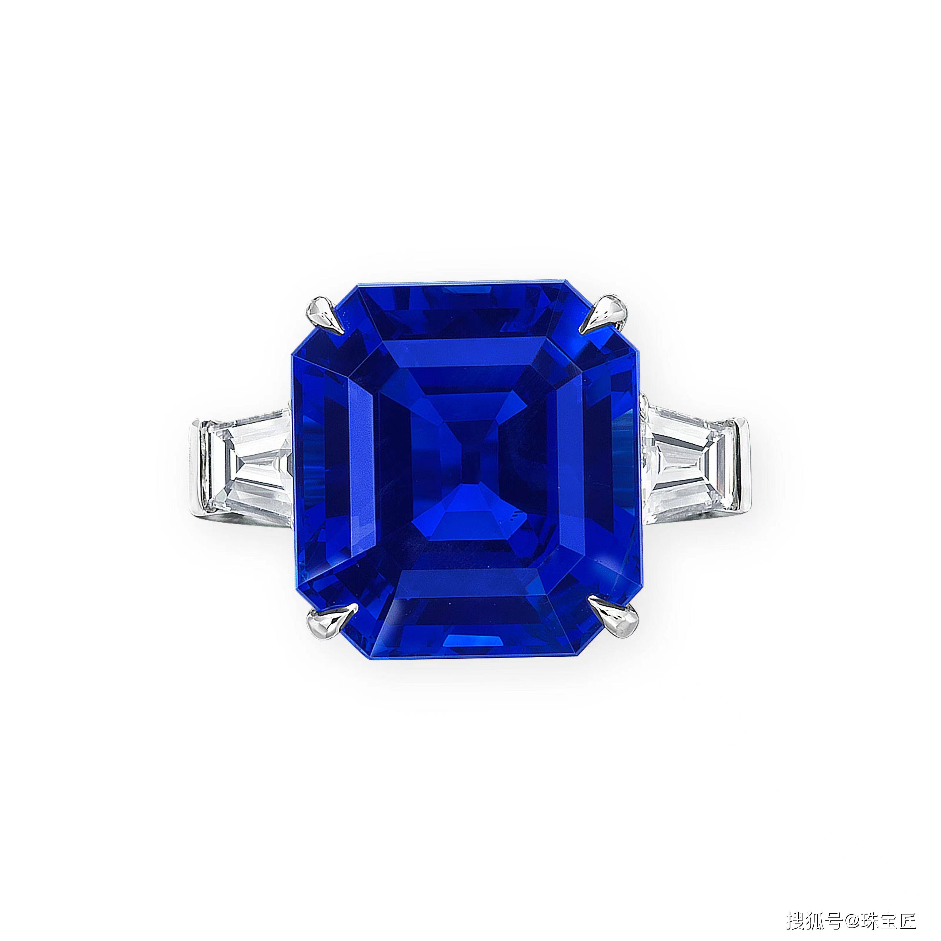 蓝宝石及钻石戒指,主石是一枚13.09克拉长方形缅甸天然皇家蓝蓝宝石,配0.4克拉及0.37克拉F-G/VVS-VS1钻石,附SSEF、古柏林及GIA 证书;