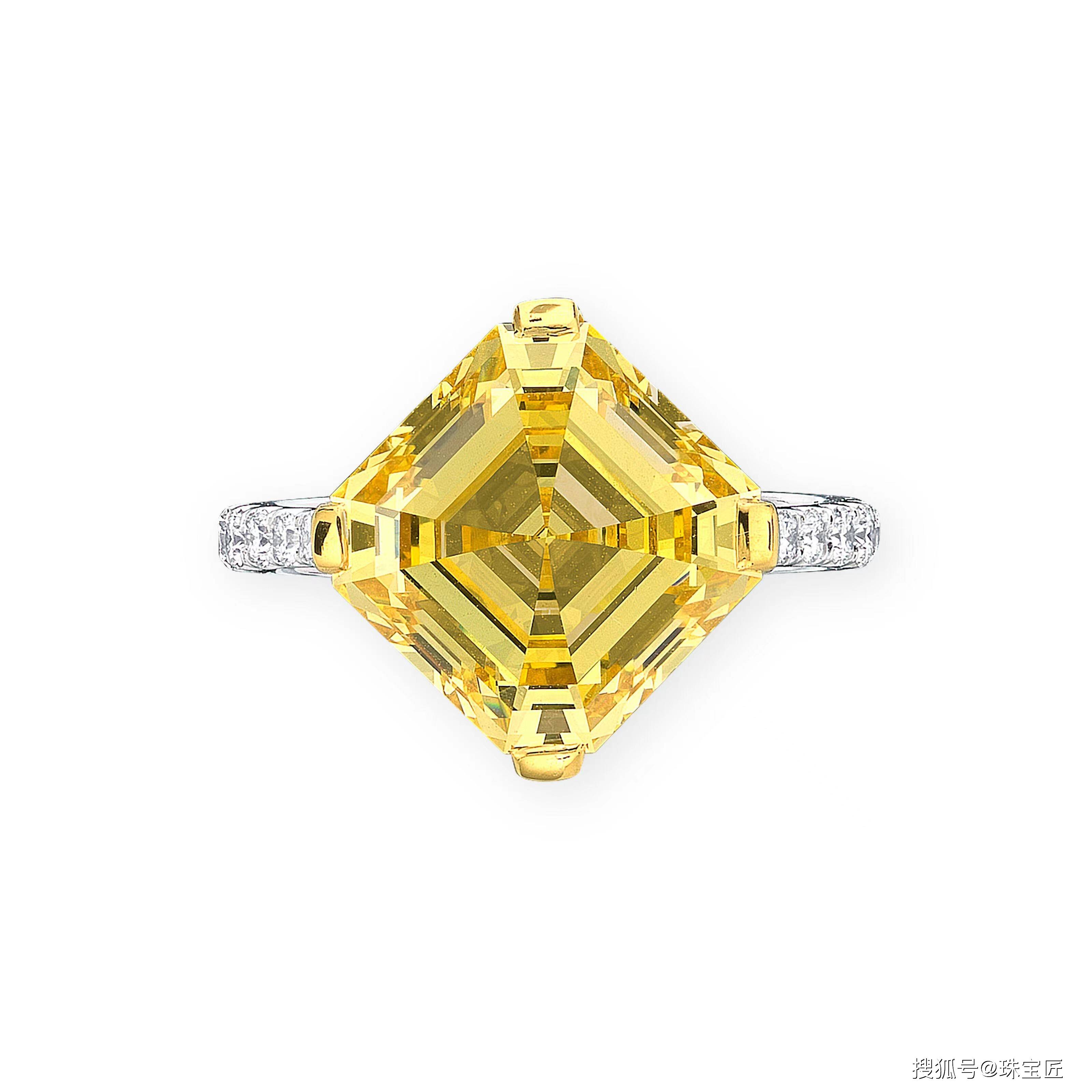 黄色钻石及钻石戒指,主石是一颗7.36克拉正方形艳彩黄色VVS钻石,戒臂以小克拉钻石作为点缀,附GIA证书;