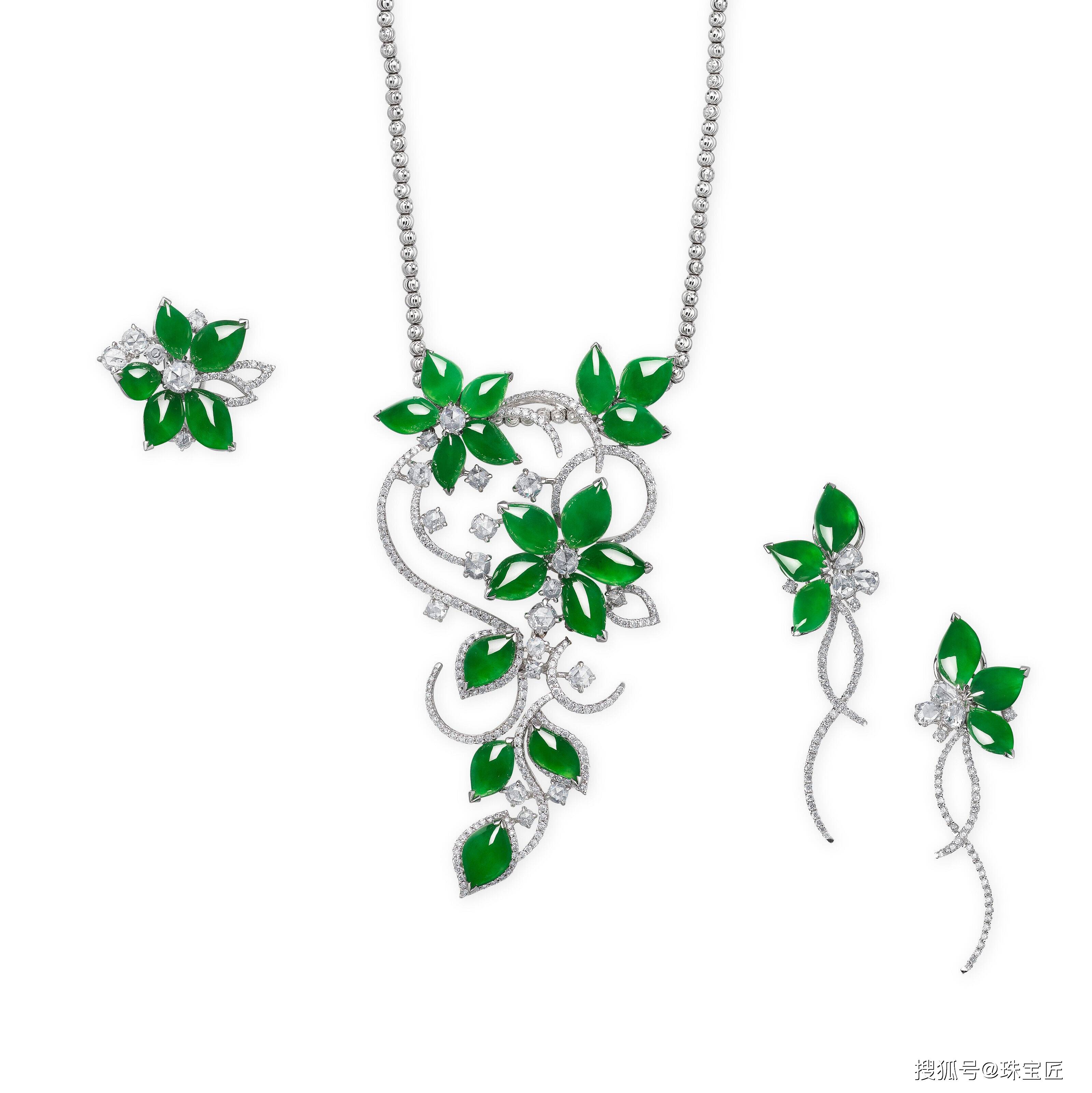 天然翡翠首饰套装,翡翠最大尺寸为12.8*7.8*3.6mm,项链长44cm,耳环长6.3cm,配以钻石作为点缀;