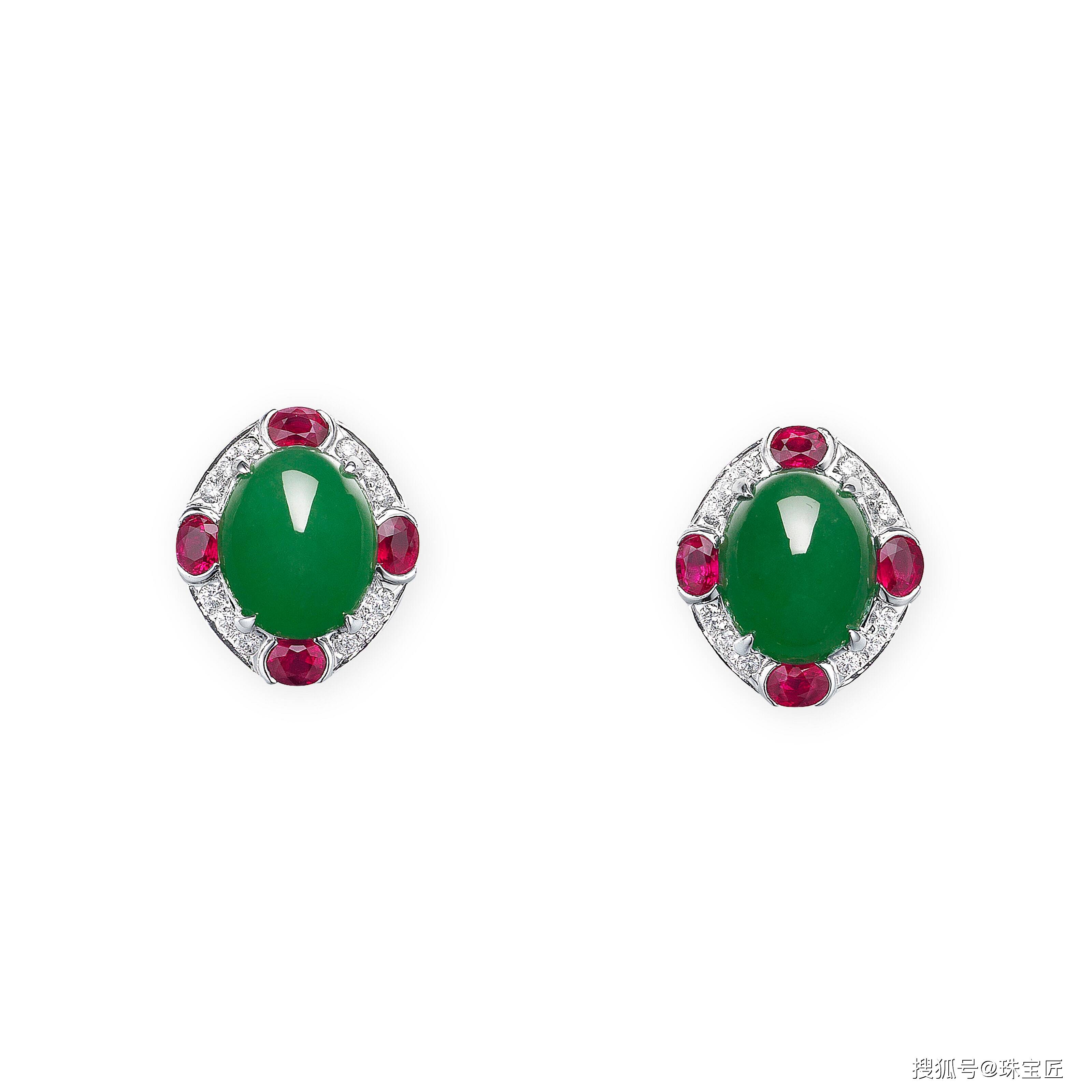 天然翡翠蛋面耳环,翡翠蛋面为14.1*11.6*6.4mm,配以红宝石及钻石作为点缀;