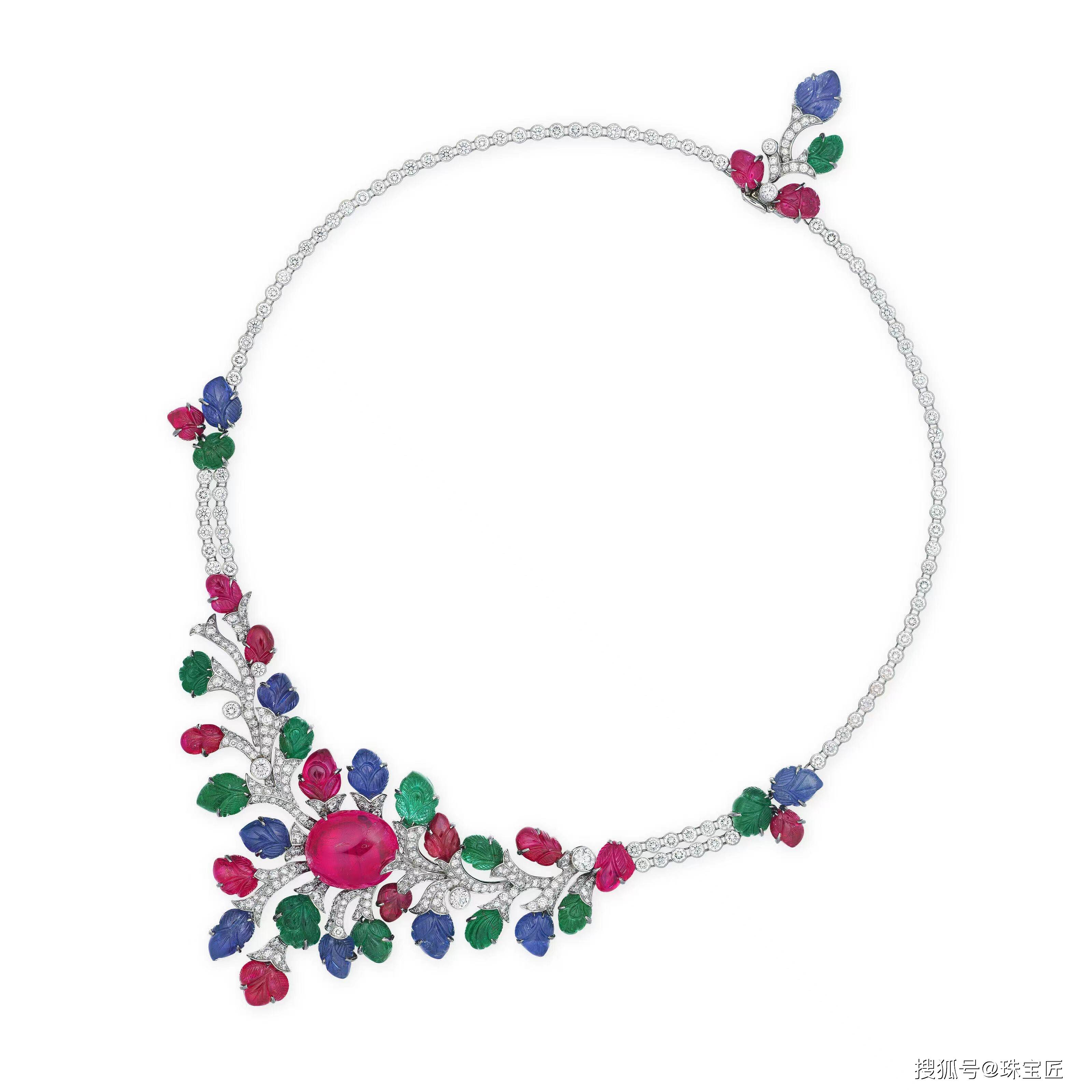 卡地亚设计,主石是一枚14.04克拉缅甸天然红宝石,配以雕刻祖母绿、雕刻红宝石、雕刻蓝宝石作为点缀, 项链长度为38.3cm;