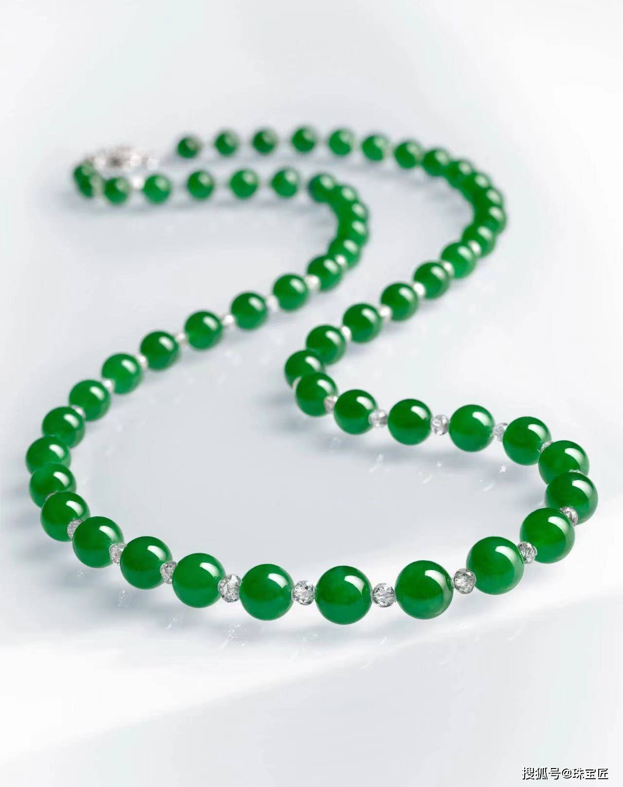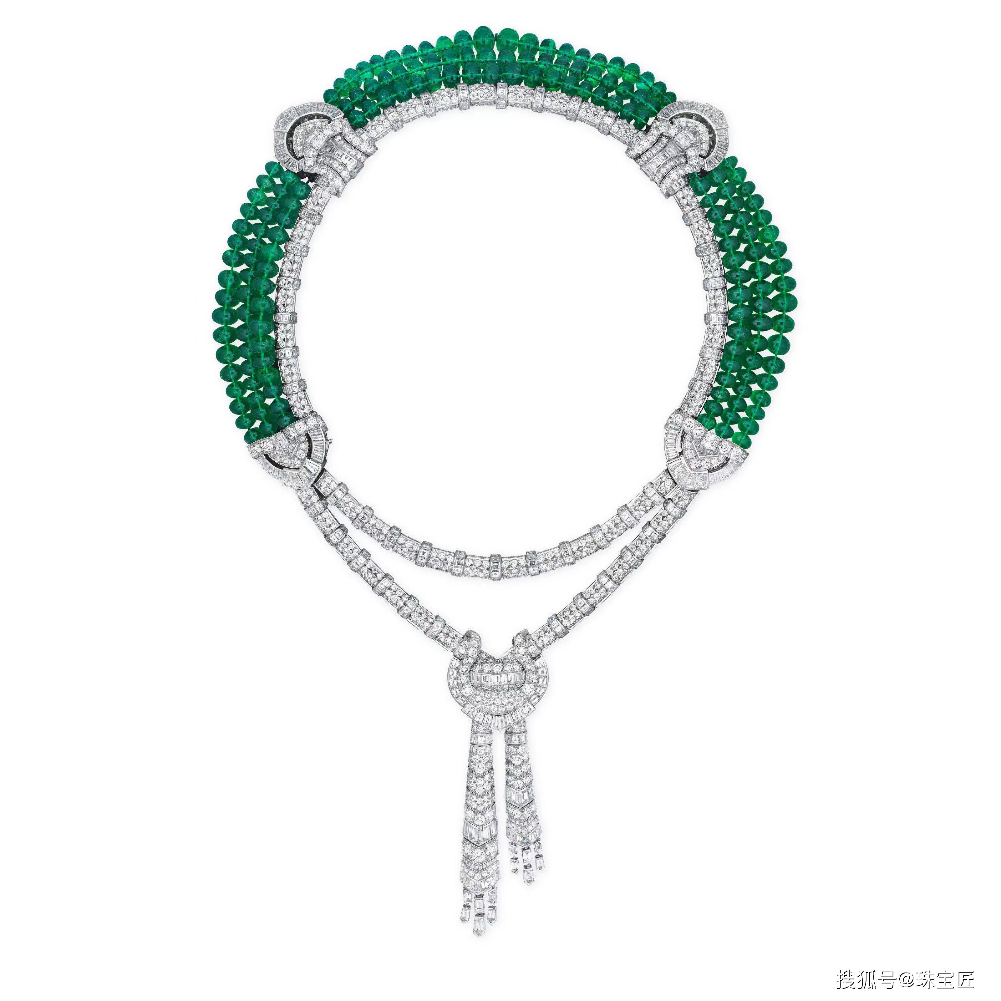 梵克雅宝设计,由祖母绿圆珠和钻石镶嵌而成,项链内周长38.3cm,下方采用流苏设计;