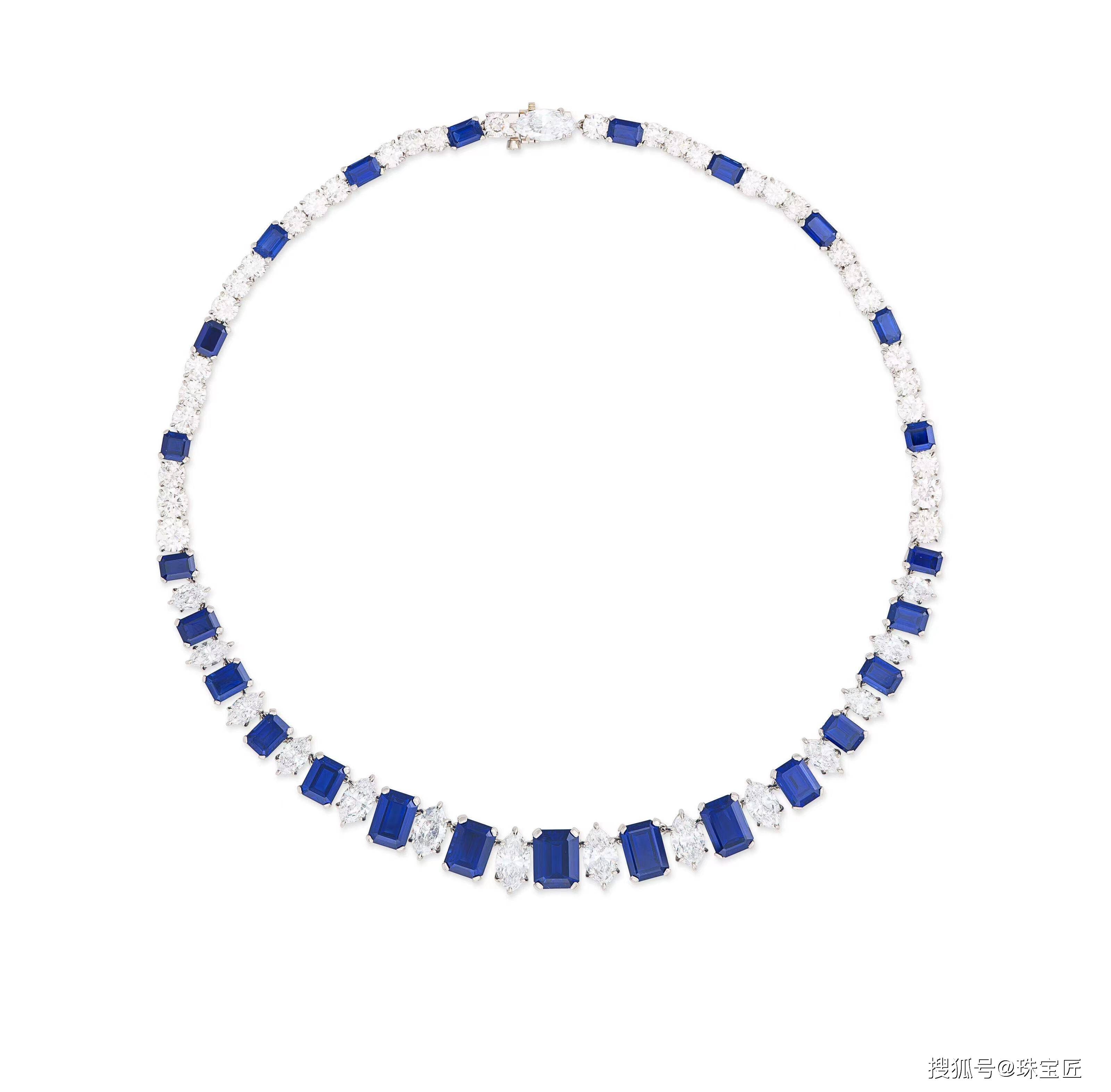蓝宝石钻石项链,周长为39.5cm,由钻石与蓝宝石交替镶嵌而成,蓝宝石在0.73克拉——4.7克拉之间,长方形切割,产自克什米尔或非洲,附SSEF、古柏林证书;