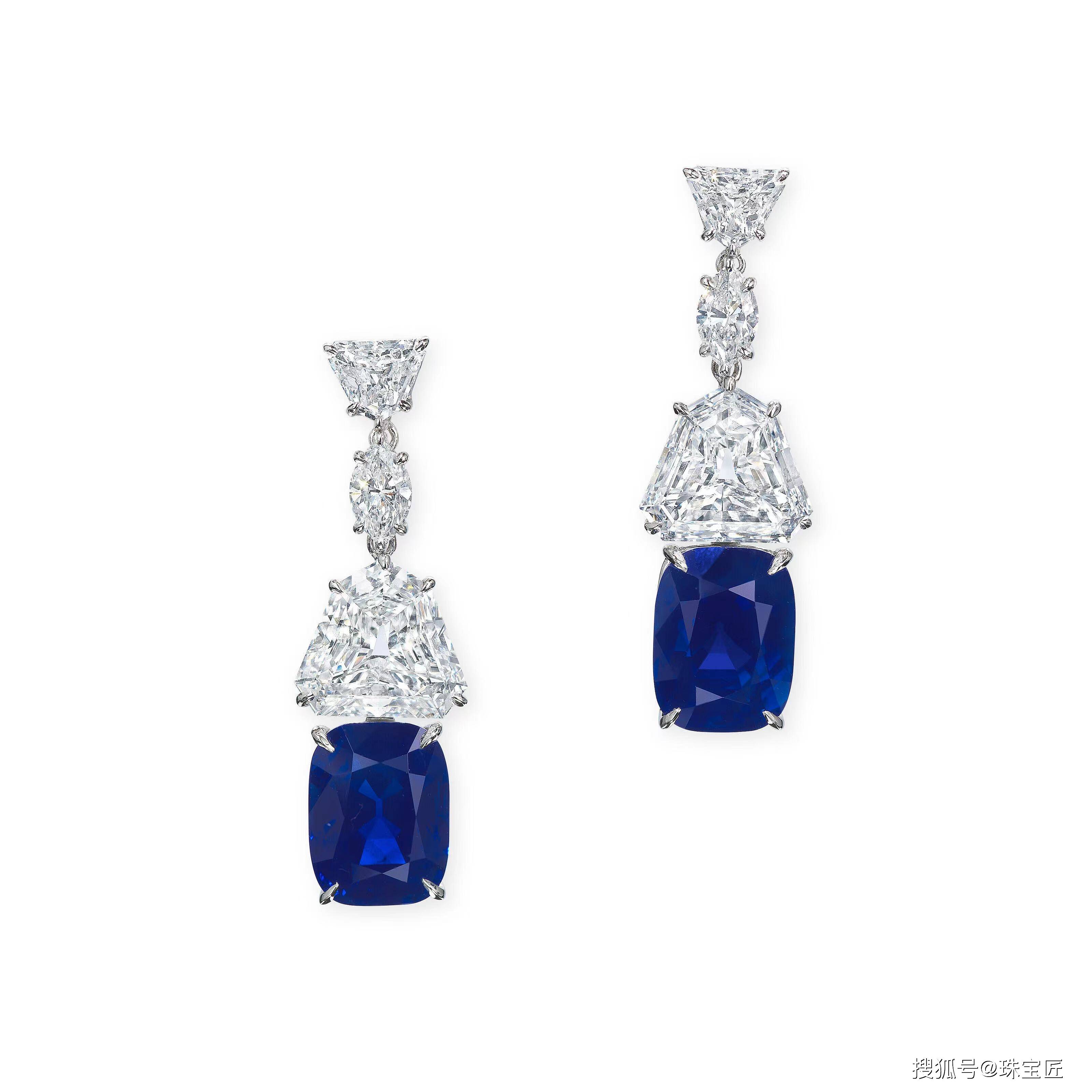 蓝宝石及钻石耳环,主石是7.75克拉及6.27克拉枕型克什米尔天然皇家蓝蓝宝石,配以不同形状的钻石作为点缀,耳环长度为3.4cm,附AGL、SSEF及古柏林证书;