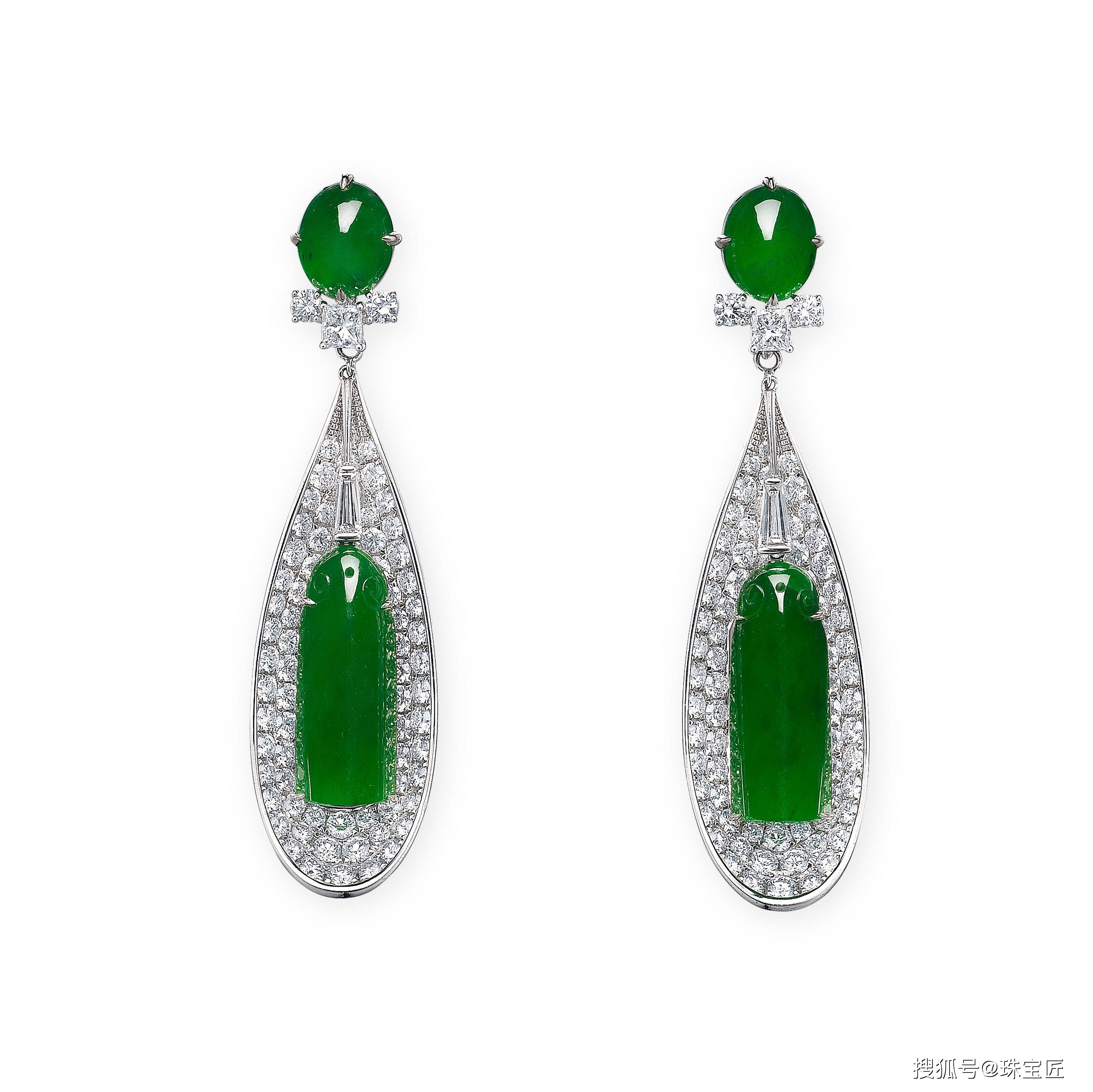 翡翠及钻石耳环,翡翠最大尺寸为20*7.8*3.6cm,配以钻石作为点缀;
