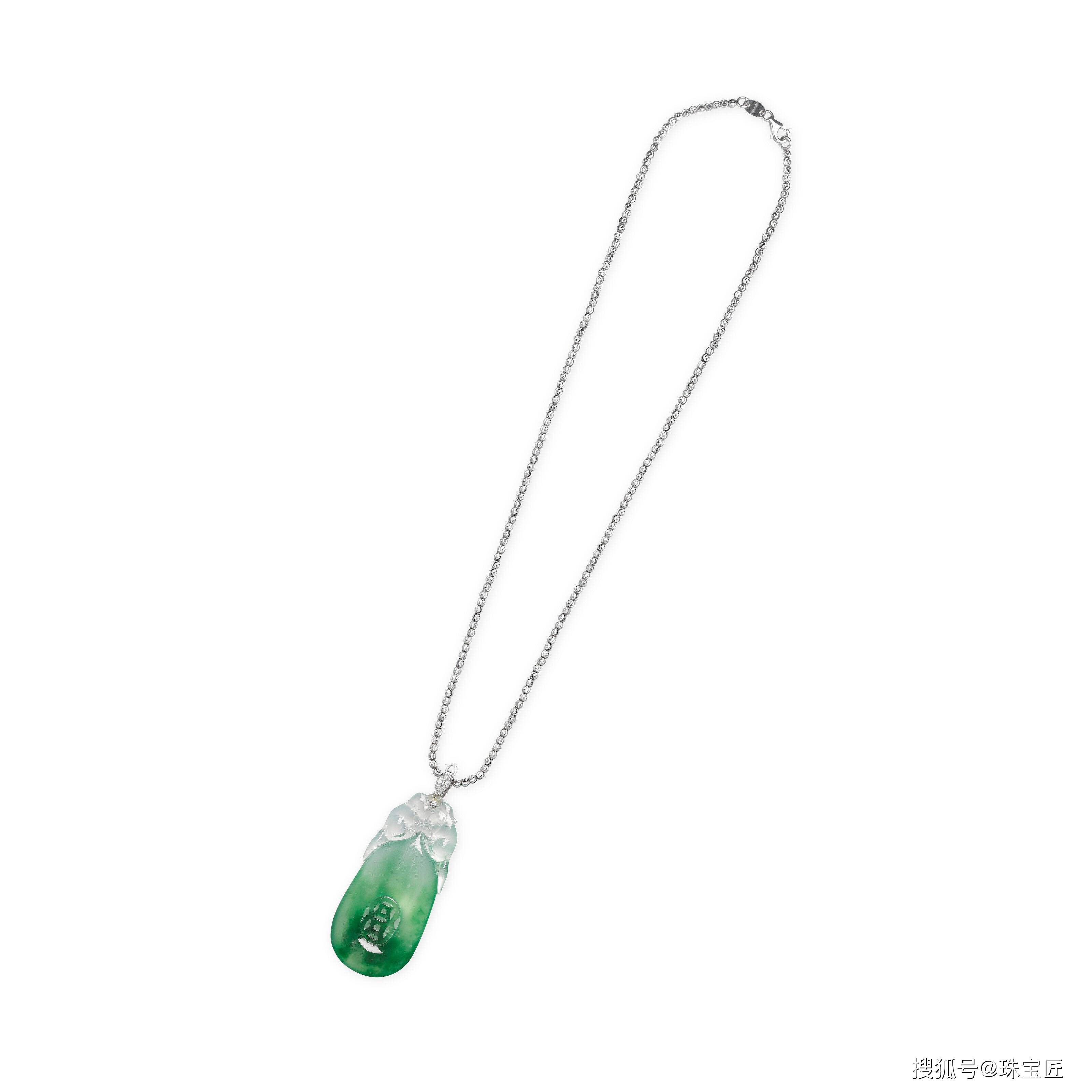 天然翡翠吊坠项链,翡翠尺寸为49.3*22.4*5.6cm,配以钻石作为点缀;