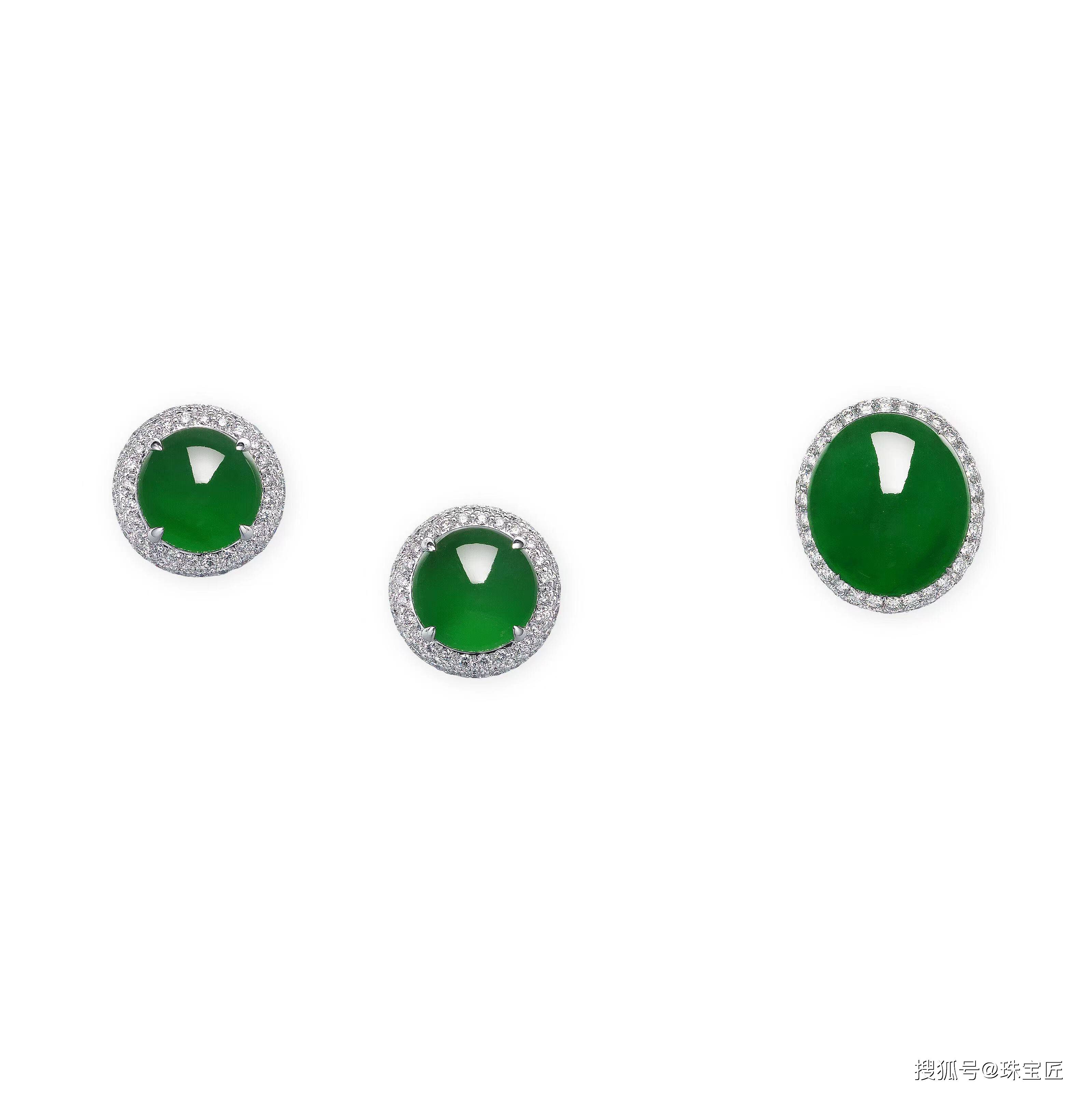 翡翠及钻石戒指、耳环套装,由戒指和耳环组成,最大蛋面为20.9*18.5*7.7mm,配以钻石作为点缀;